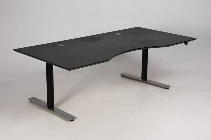 "Linak elektrisk hæve-sænkebord med sort linoleumsbordplade med mavebue og affasede kanter. Bordet har huller til to kabeludtræk.