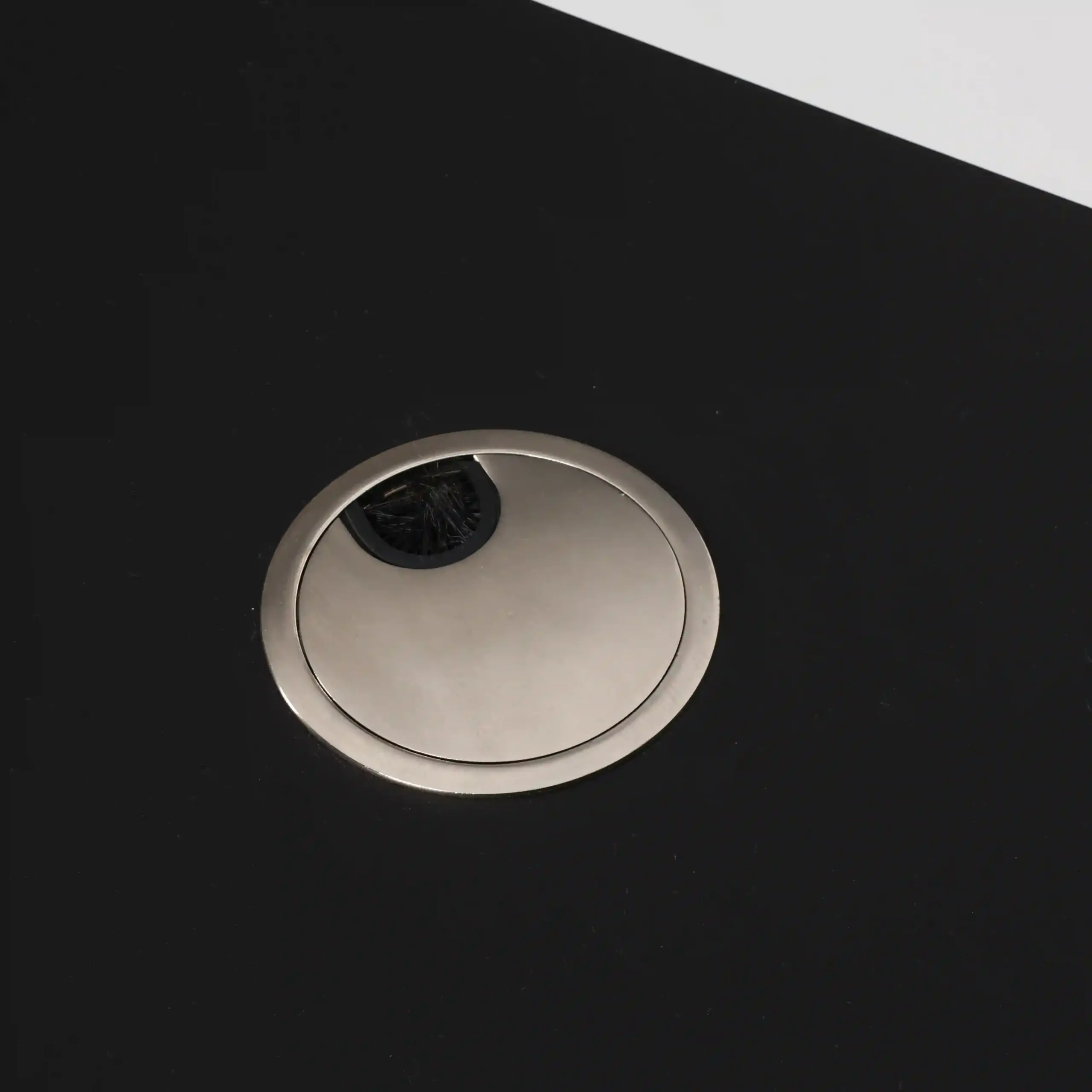 Linak hæve sænkebord med sort linoleumsbordplade med kabelgennemføring og bred mavebue fra kant til kant.