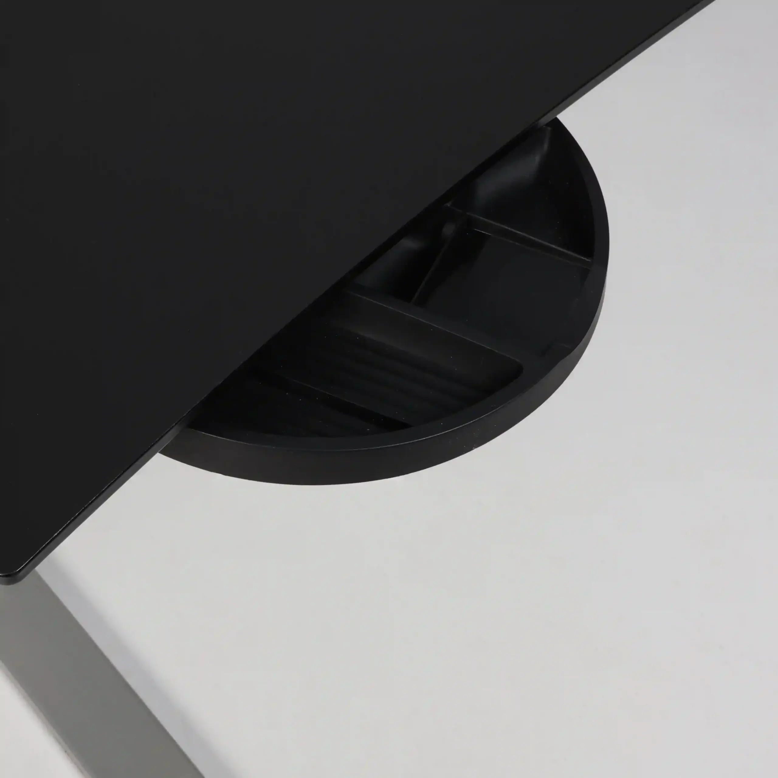 Under bordpladen er monteret en praktisk kabelbakke samt en sort, svingbar pennebakke til kuglepenne og lignende, mindre kontorartikler.