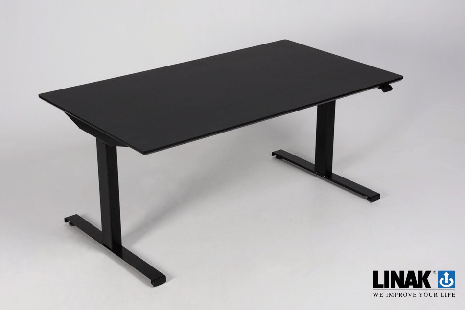 "Linak elektrisk hæve sænkebord med bordplade i sort linoleum, er et elektrisk skrivebord i høj kvalitet til professionelle kontormiljøer. Stellet er 3-leddet i sort pulverlakeret stål med motor i hvert ben. Med et motorkabel på 1,5 m. kan bordet passe ind i ethvert kontor.