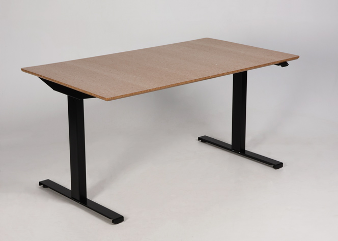 Linak hæve sænkebord med bordplade af lakeret træfiber, der er fremstillet af knuste, kasserede bordplader. 2-leddet sort stel med motor i hvert ben, som giver mulighed for at justere arbejdshøjden efter behov.