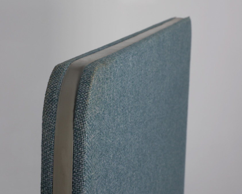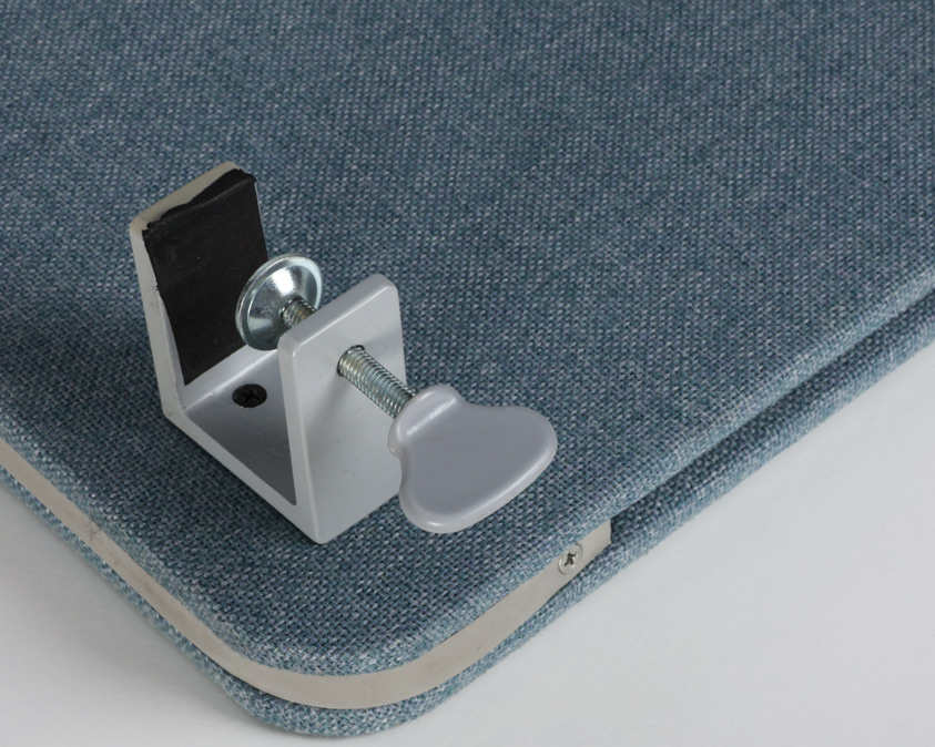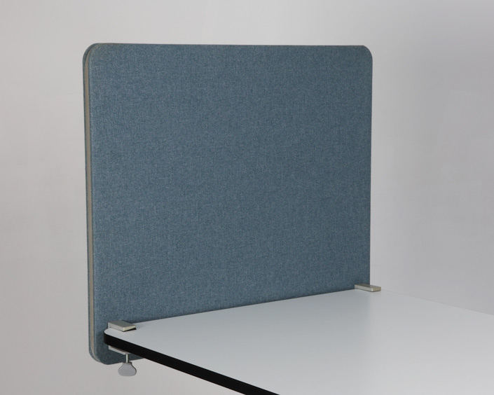 "Lintex Edge bordskærm/sideskærm i blåmeleret camira med grå gummikant, til montering med klemmer. Foruden den primære funktion, at afskærme for uro og høje lyde, er bordskærmen endvidere anvendelig som opslagstavle.