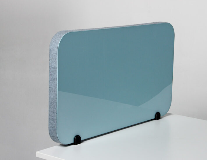 "Lintex Mood bordskærm /sideskærm med aqua blå glastavle og bordbeslag.