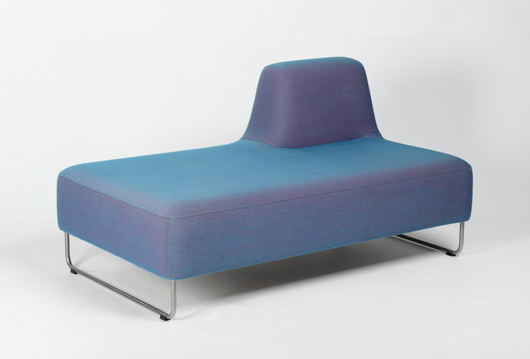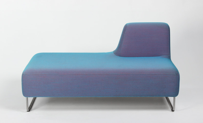 "Flot loungesofa med ryglæn i højre side – model UGO 203 fra norske LK Hjelle. Sofaen har en fast polstring, og den unikke sammensætning af farverne i betrækket, changere til en metallic-lignende nuance alt efter belysningen omkring.