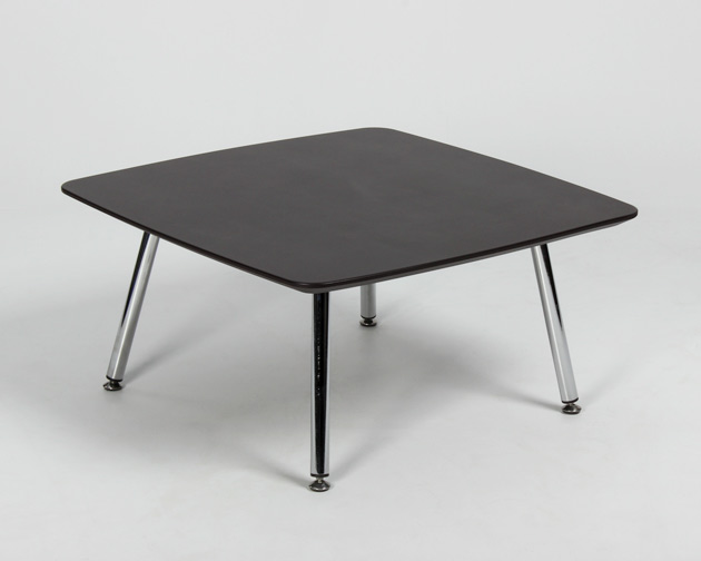 "Loungebord med sort linoleumsbordplade med afrundede hjørner og affaset kant. Blankforkromede ben med stilleskruer, der sikre bordet altid står fast på et ujævnt gulv.