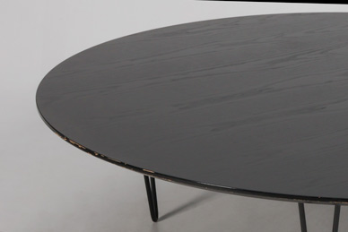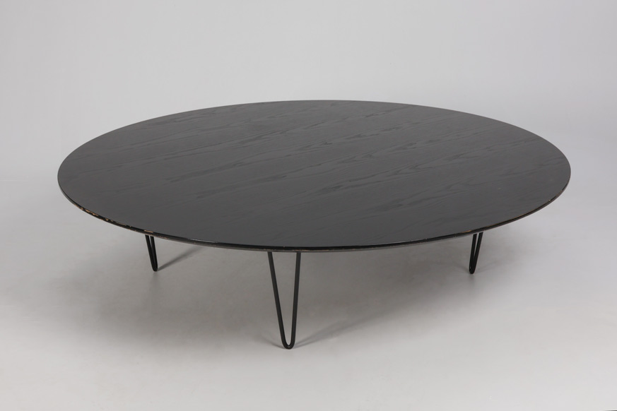 "Stort loungebord med bordplade i sortlakeret træ og fire sorte bøjleben.