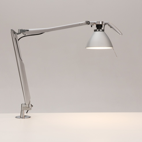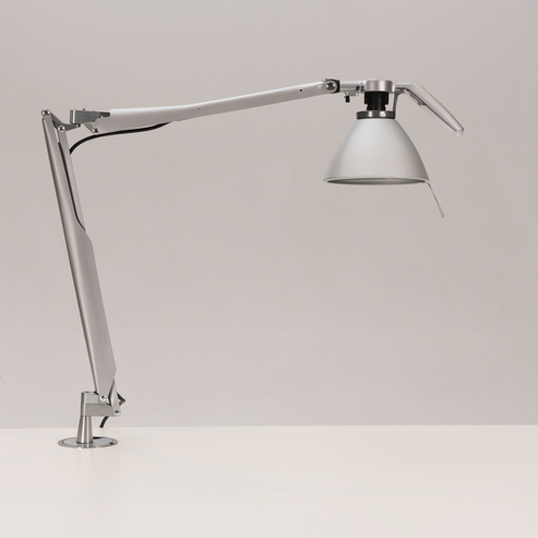 "Luceplan Fortebraccio D33N bordlampe med bordbolt til montering gennem bordpladen, på skrive- eller hæve sænkebordet. Den italiensk-designede skrivebordslampe har et yderst fleksibelt hoved, som ved hjælp af grebet på lampeskærmen, nemt styres hvorhen hvor der ønskes belyst.