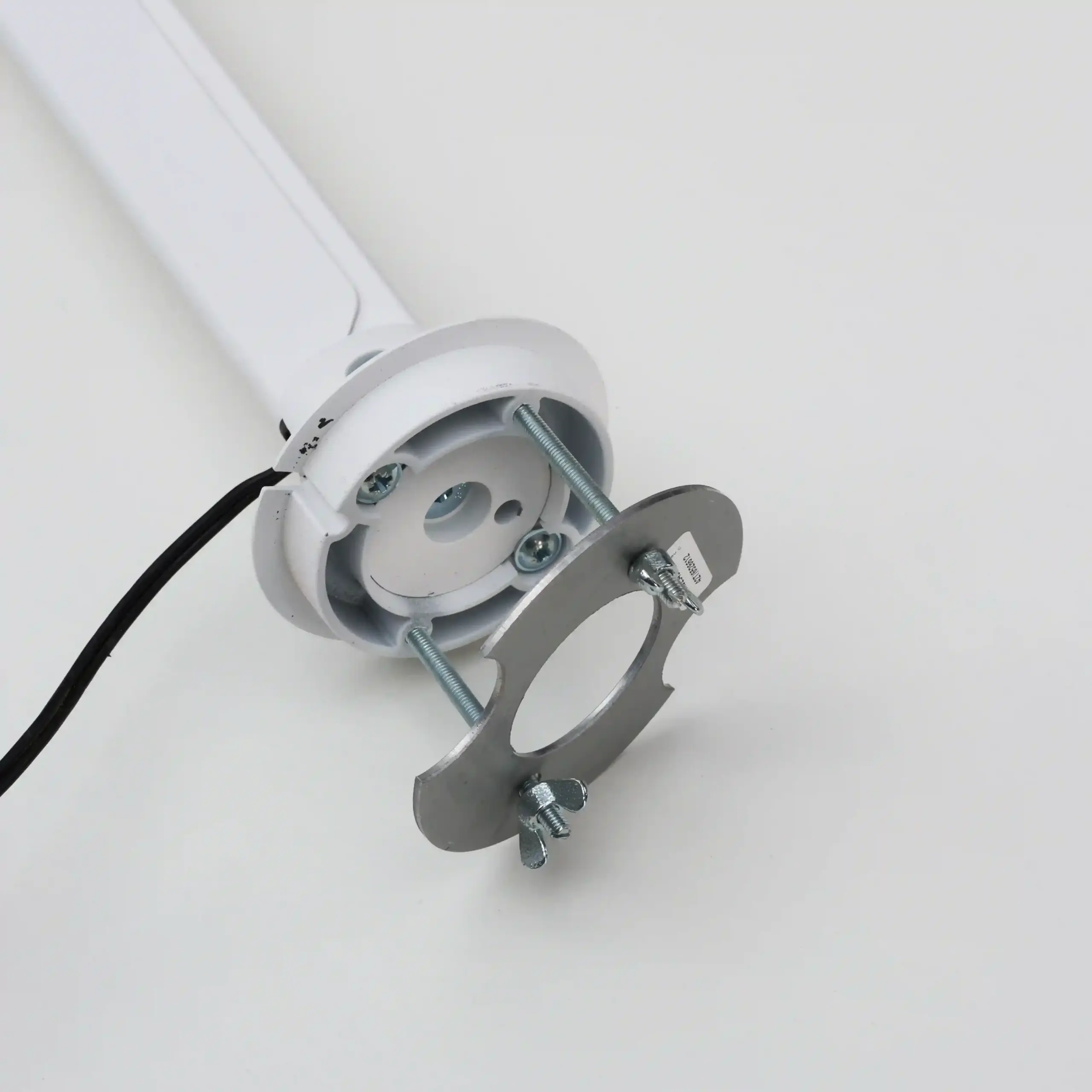 Lampen har monteret en gevindstang forenden, der føres gennem et forboret hul (Ø60 mm) i bordpladen, og fastgøres herefter med beslaget på undersiden.