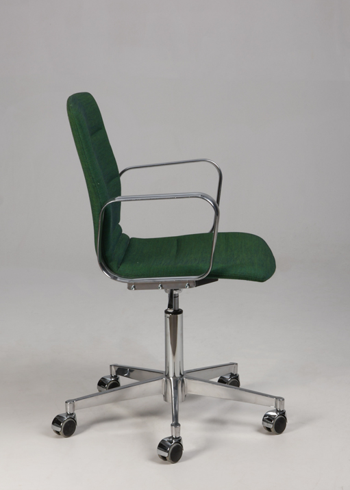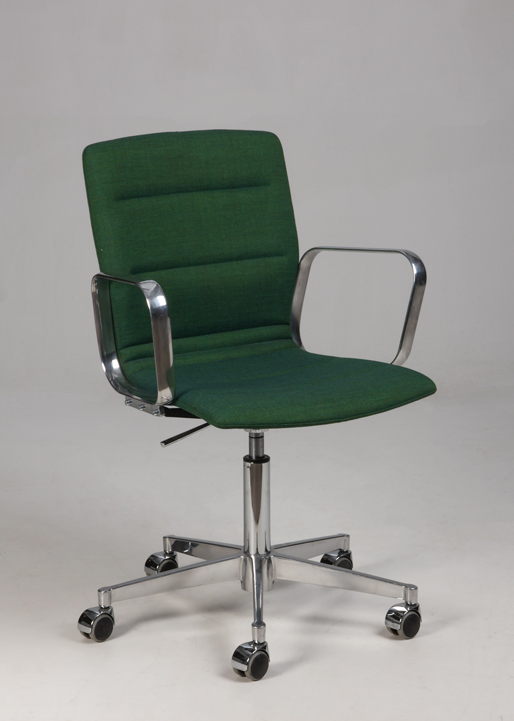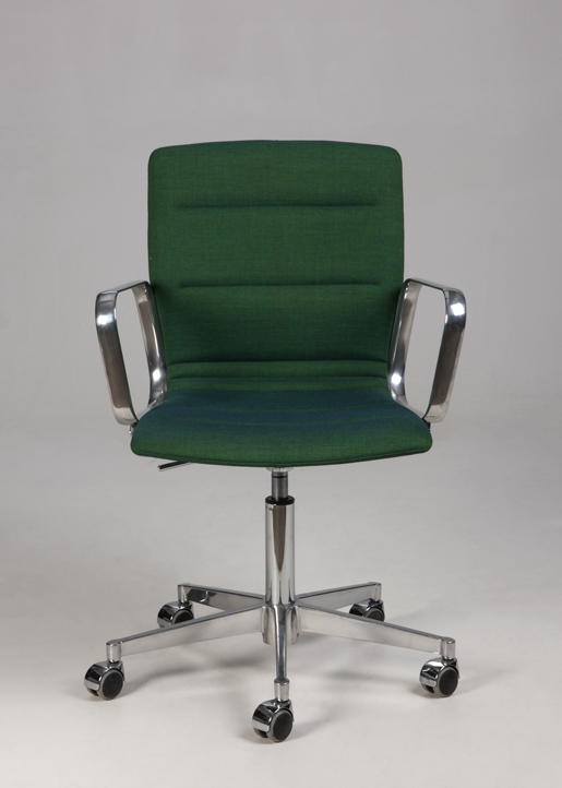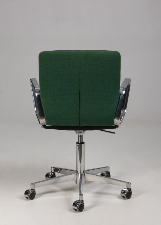 Designstolen har faste armlæn og fodkryds i poleret aluminium med gummibanehjul, samt ryglæn med en anelse fleksibilitet.