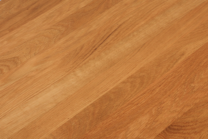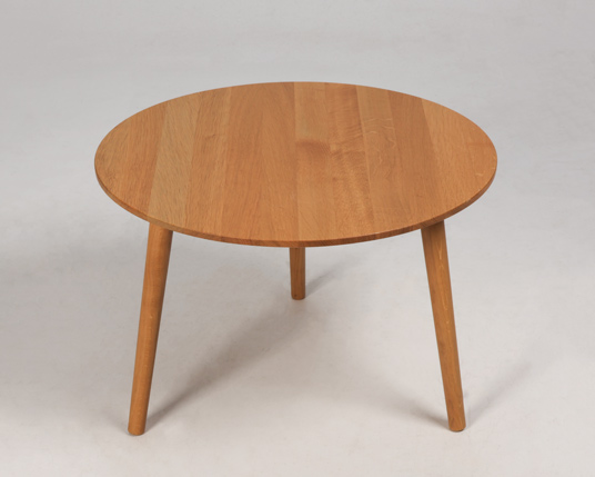 "Mindre rundt Magnus Olesen lounge- og sofabord med egetræsbordplade og koniske, skrå ben.