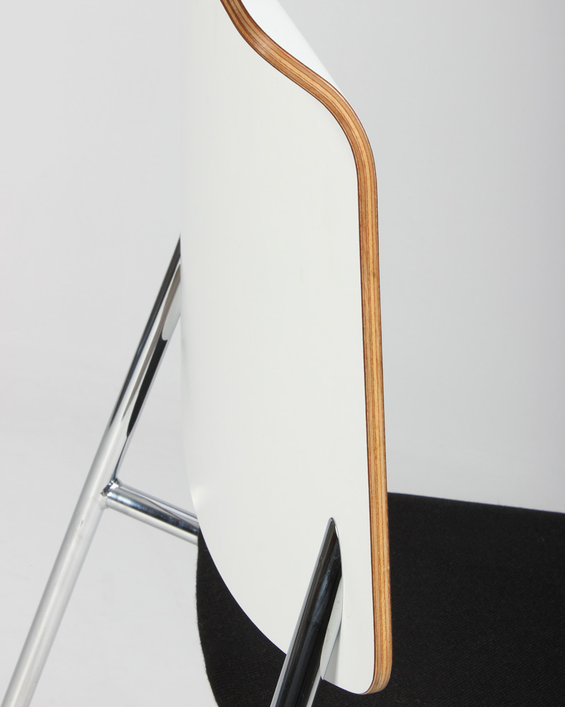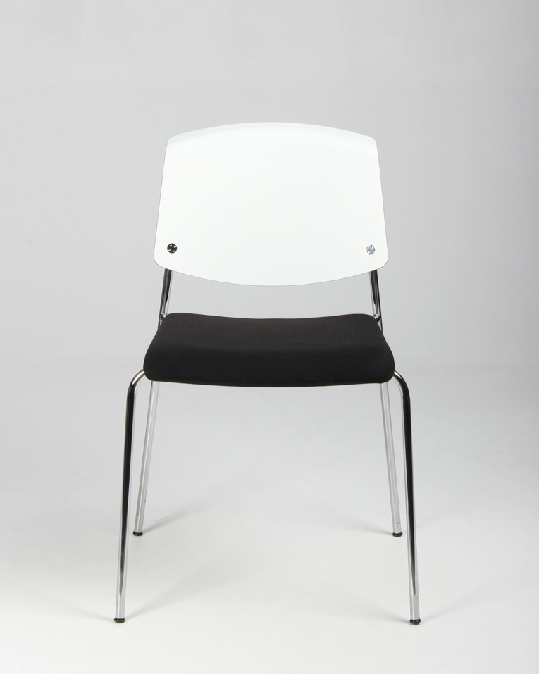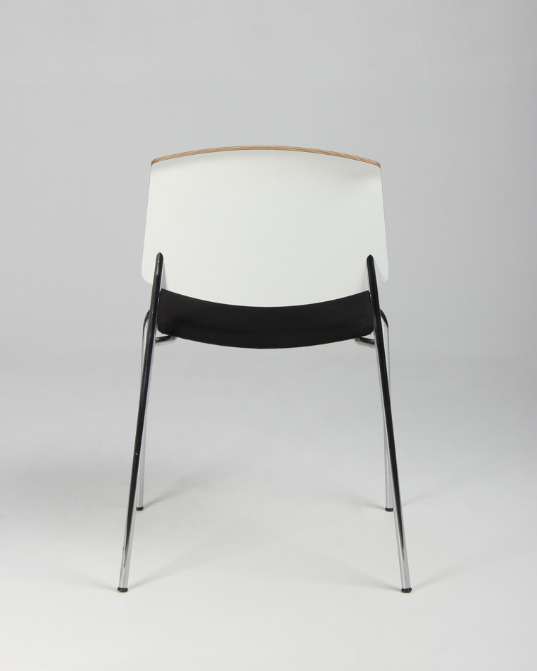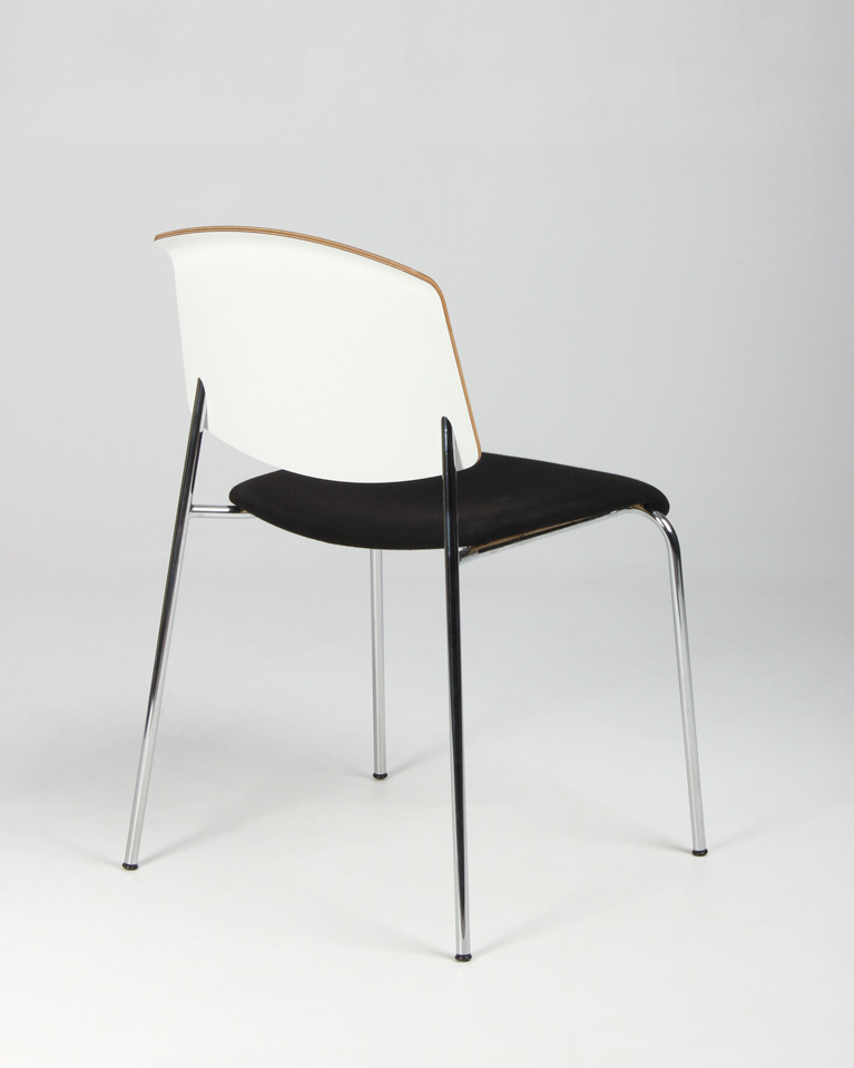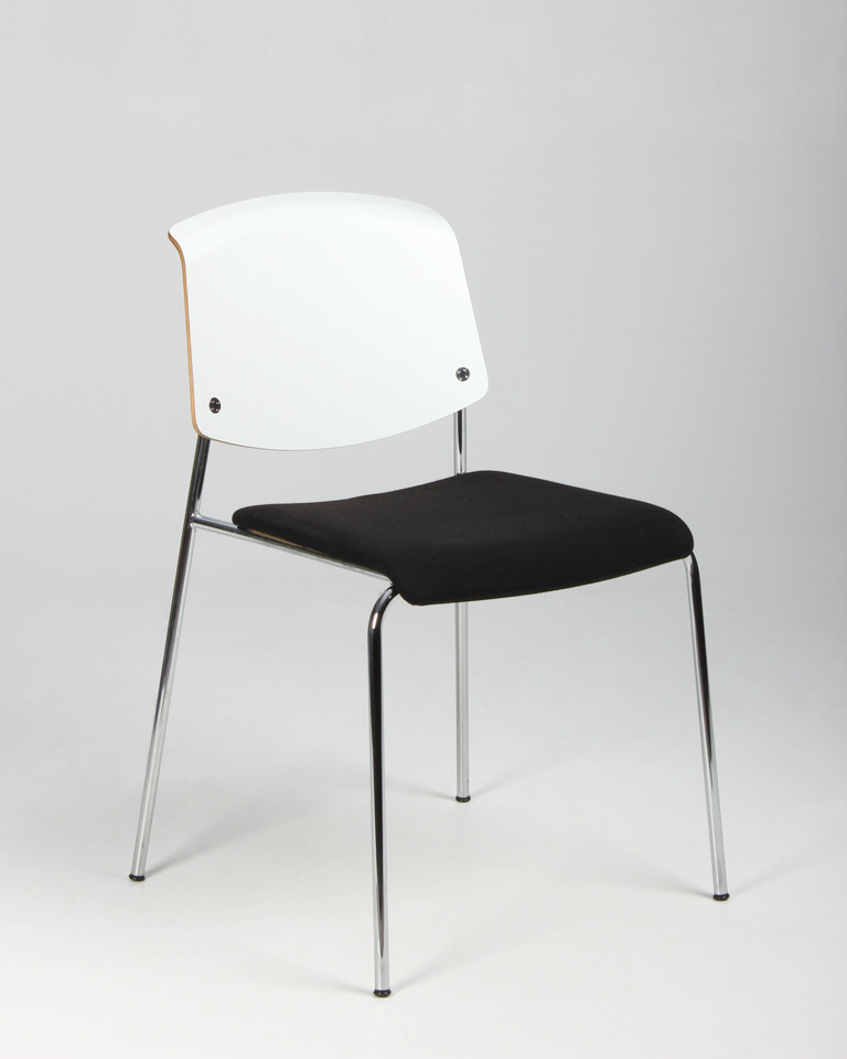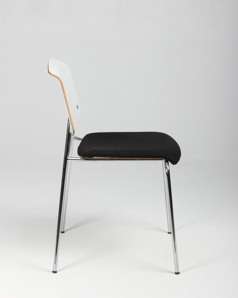 "Magnus Olesen Pause konferencestol med polstret sort sæde i fame samt ryglæn i hvidlakeret krydsfinér med synlig trækant. Stolen har krom stel er stabelbar og er et enkelt, tidløst og praktisk valg til eksempelvis mødelokalet eller kantinen.
