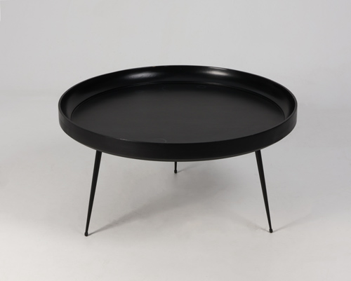"Mater model Bowl loungebord i sortmalet mangotræ. Bordpladen er omgivet af en høj kant og har tre runde metalben.