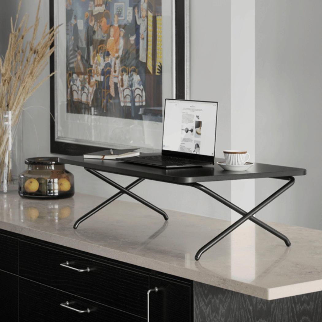 "Brugt Matting StandUp Mini Desk – et kompakt, højdejusterbart bord designet til at skabe en ergonomisk arbejdsplads, hvor der ikke er plads til et traditionelt hæve-sænkebord. Bordet placeres direkte ovenpå et eksisterende skrive- eller spisebord og forvandler derved din siddeplads til en stående arbejdsstation. Det manuelle hæve-sænkesystem gør det nemt at justere højden, og den stabile konstruktion sikrer en solid arbejdsflade. Den kompakte størrelse gør det oplagt til små rum, hjemmekontorer og midlertidige arbejdsstationer. Samtidig gør det stilrene og diskrete design, at bordet også kan fungere som et stabilt højdejusterbart loungebord eller sofabord – enten permanent eller når det ikke er i brug som arbejdsstation. Fremstår i god stand!