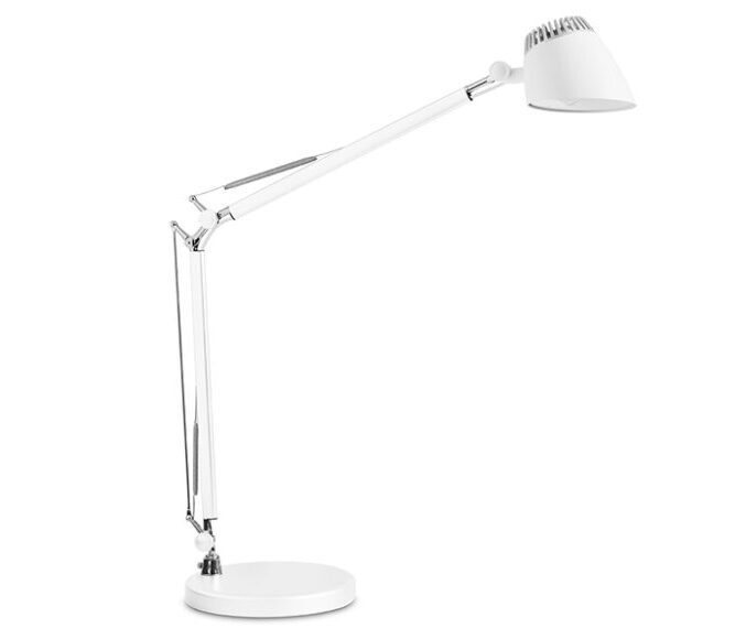 Matting Valencia hvid bordlampe med kromdetaljer i leddene. Med en tretrins lysdæmper kan du nemt justere lyset efter omgivelserne, og den automatiske slukketimer sikrer, at du aldrig glemmer at slukke lampen ved fyraften.