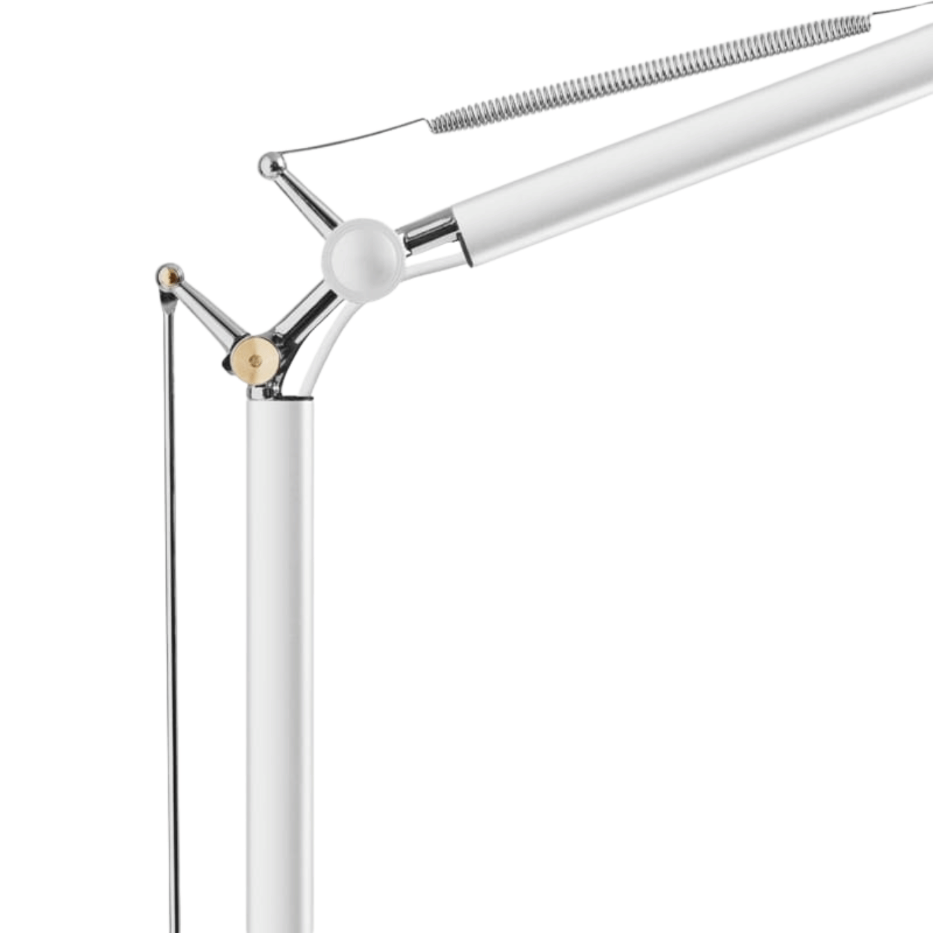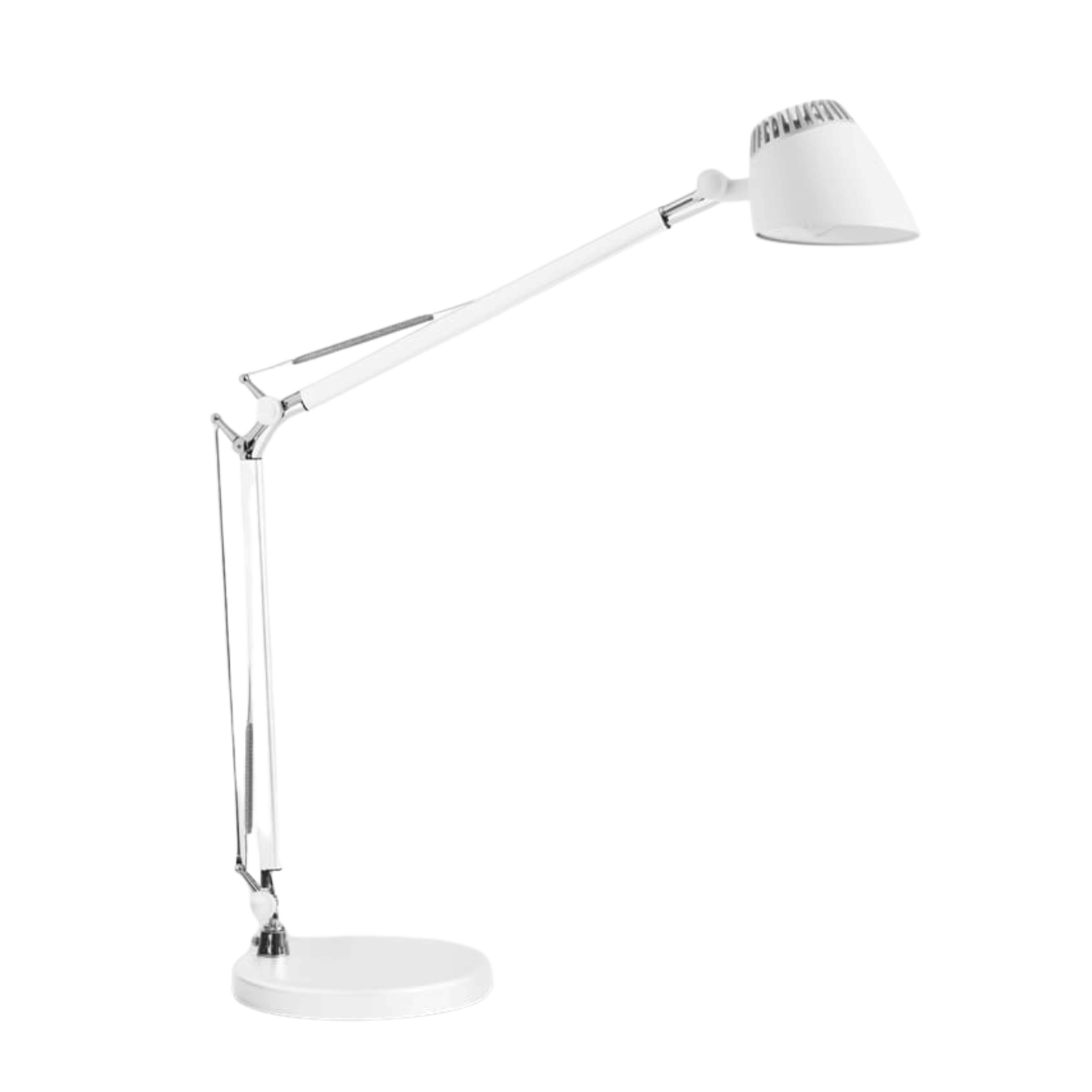 "Matting Valencia hvid bordlampe med kromdetaljer i leddene. Med en tretrins lysdæmper kan du nemt justere lyset efter omgivelserne, og den automatiske slukketimer sikrer, at du aldrig glemmer at slukke lampen ved fyraften.