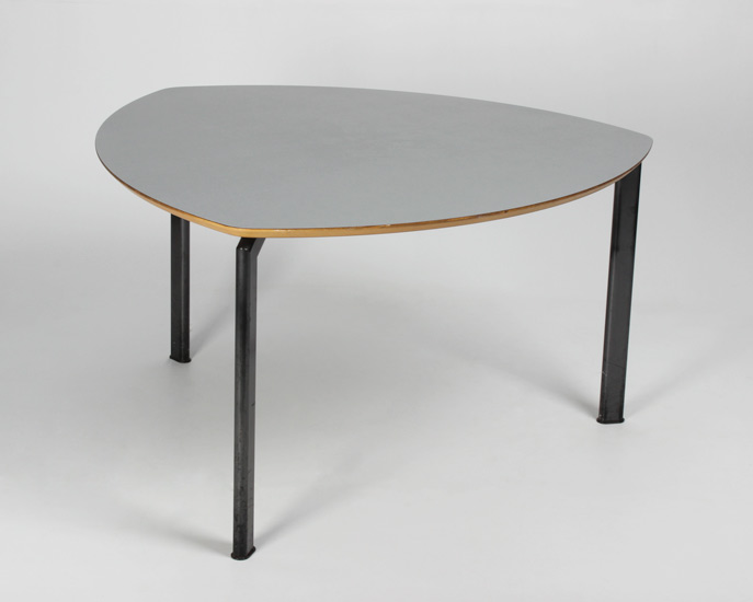 "Unikt udformet bord i grå laminat med lakeret MDF-kant og sort metalstel. Bordet har – alt efter stolebredde – plads til to stole mellem hvert bordben.