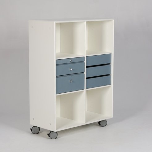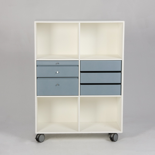 "Montana CO16 skab i hvid og blåmetallic på låsbare hjul.