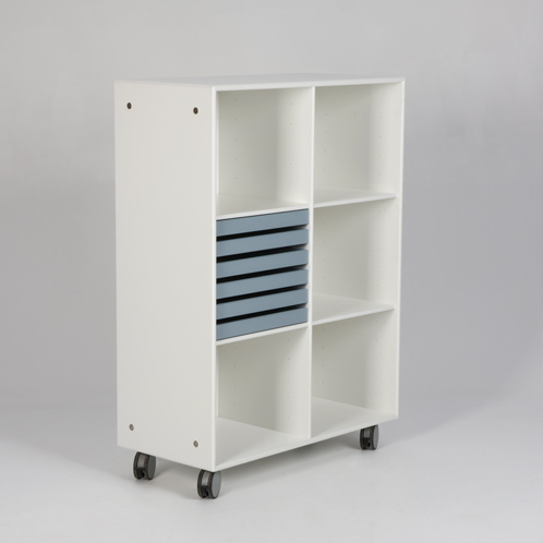 "Montana CO16 reol i hvid og blåmetallic på låsbare hjul.