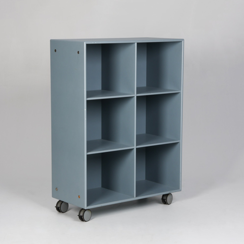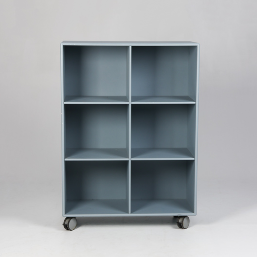 "Montana CO16 reol med seks rum i en gråblå med metallisk skær og låsbare hjul.