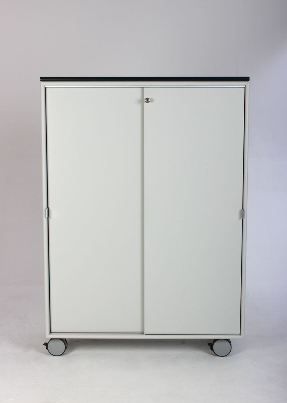 Montana CO16 skab i lys grå på låsbare hjul med original topplade i mat sort linoleum.