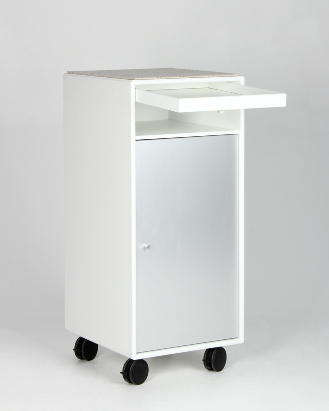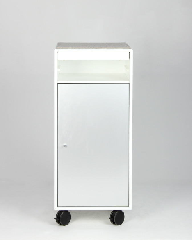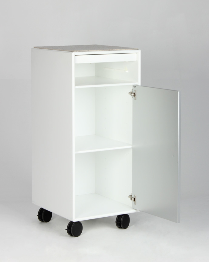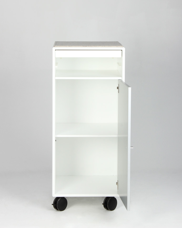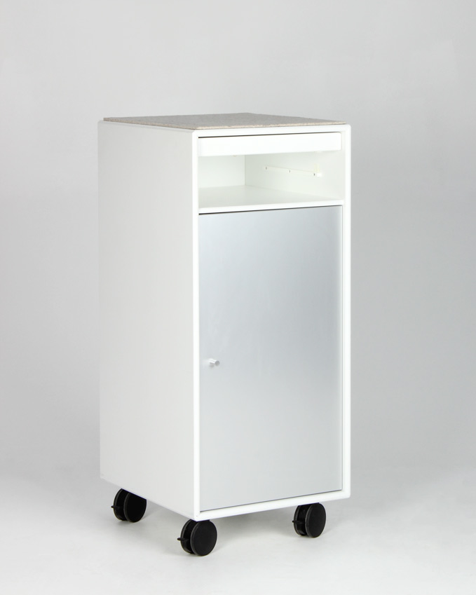 "Montana CO16 skabsmodul i hvidmalet MDF med sølvmetallic låge. Modulet indeholder god opbevaringsplads og er indrettet med smal skuffe øverst, åben hylde samt skabslåge. Filtpladen på toppen skåner for ridser og skrammer ved aflægning af genstande, mens de låsbare hjul gør den nem at håndtere i forbindelse med rengøring eller omrokering. Et elegant designet opbevaringsmodul med et let udtryk.