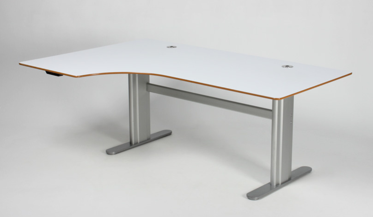 "Montana Djob elektrisk venstrevendt hæve sænkebord i hvid laminat med afrundet, lakeret MDF-kant. Elegant og stilfuldt design, med god plads til én eller flere skærme samt diverse kontorartikler. Det stilfulde stel er to-leddet med integreret kabelbakke til samling og opbevaring af ledninger.