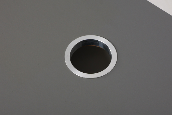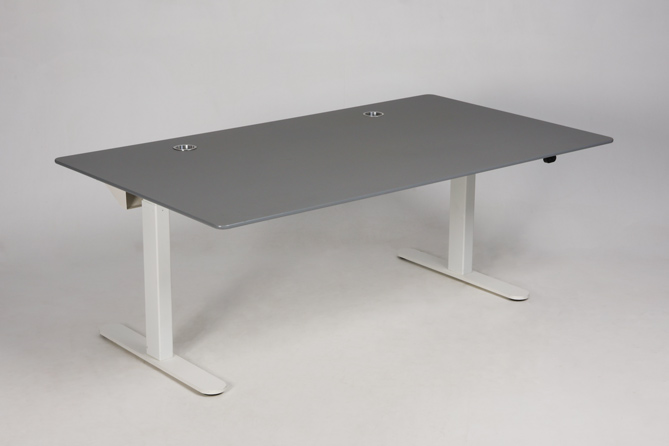 "Flot Montana HiLow elektrisk hæve sænkebord med grå linoleumsbordplade, lys grå afrundet kant og to forkromede rosetter til gennemføring af kabler.