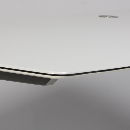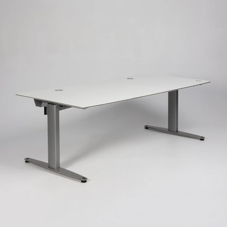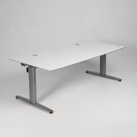 "Kombination af to kvalitets-brands – Montana og Bondo. Elektrisk hæve-sænkebord med hvid Montana-bordplade med afrundede hjørner og kanter, med beskyttende gummikant.