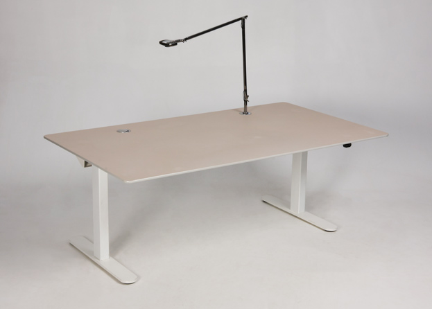 "Flot Montana HiLow elektrisk hæve sænkebord med beige linoleumsbordplade med integreret bordlampe kabelgennemføringer.