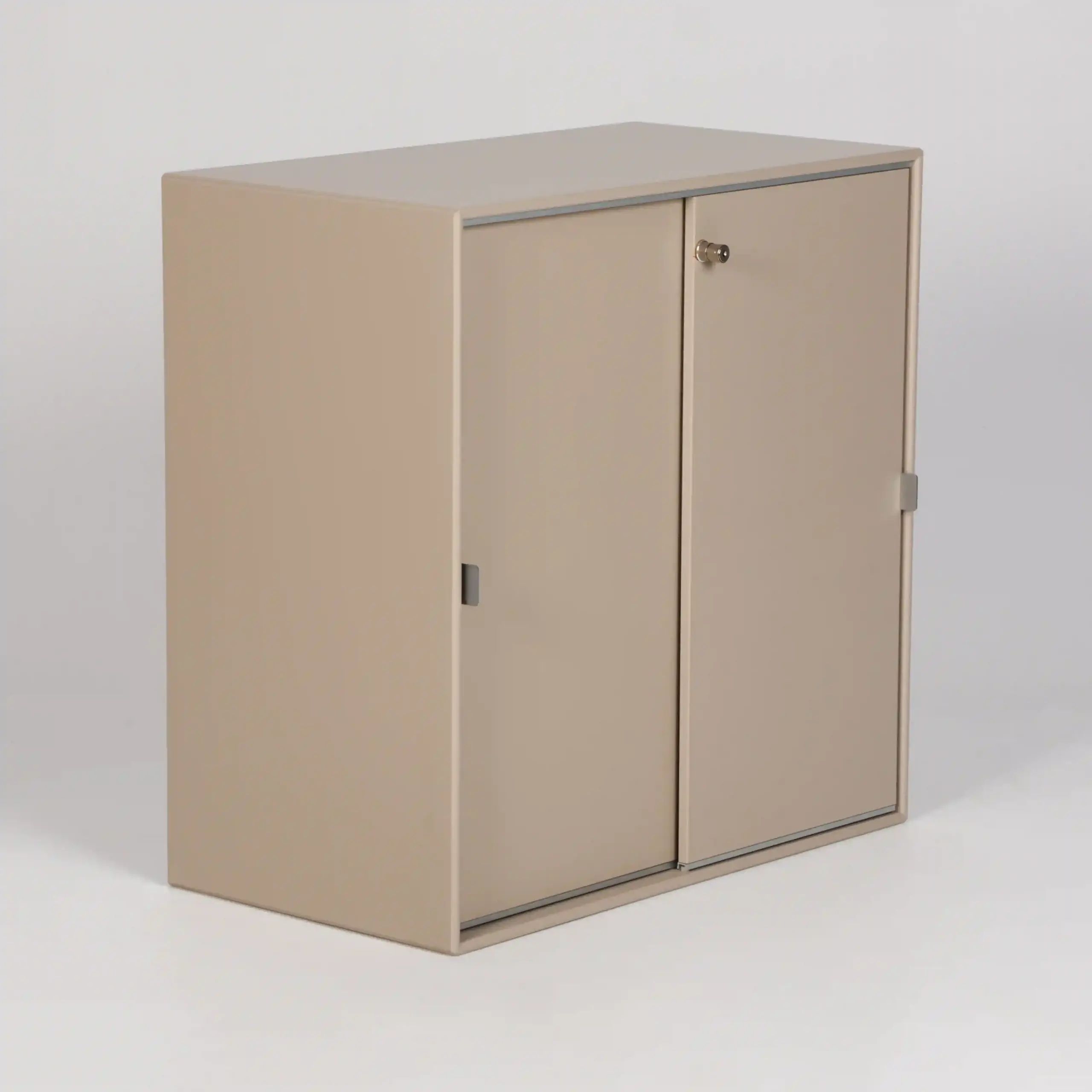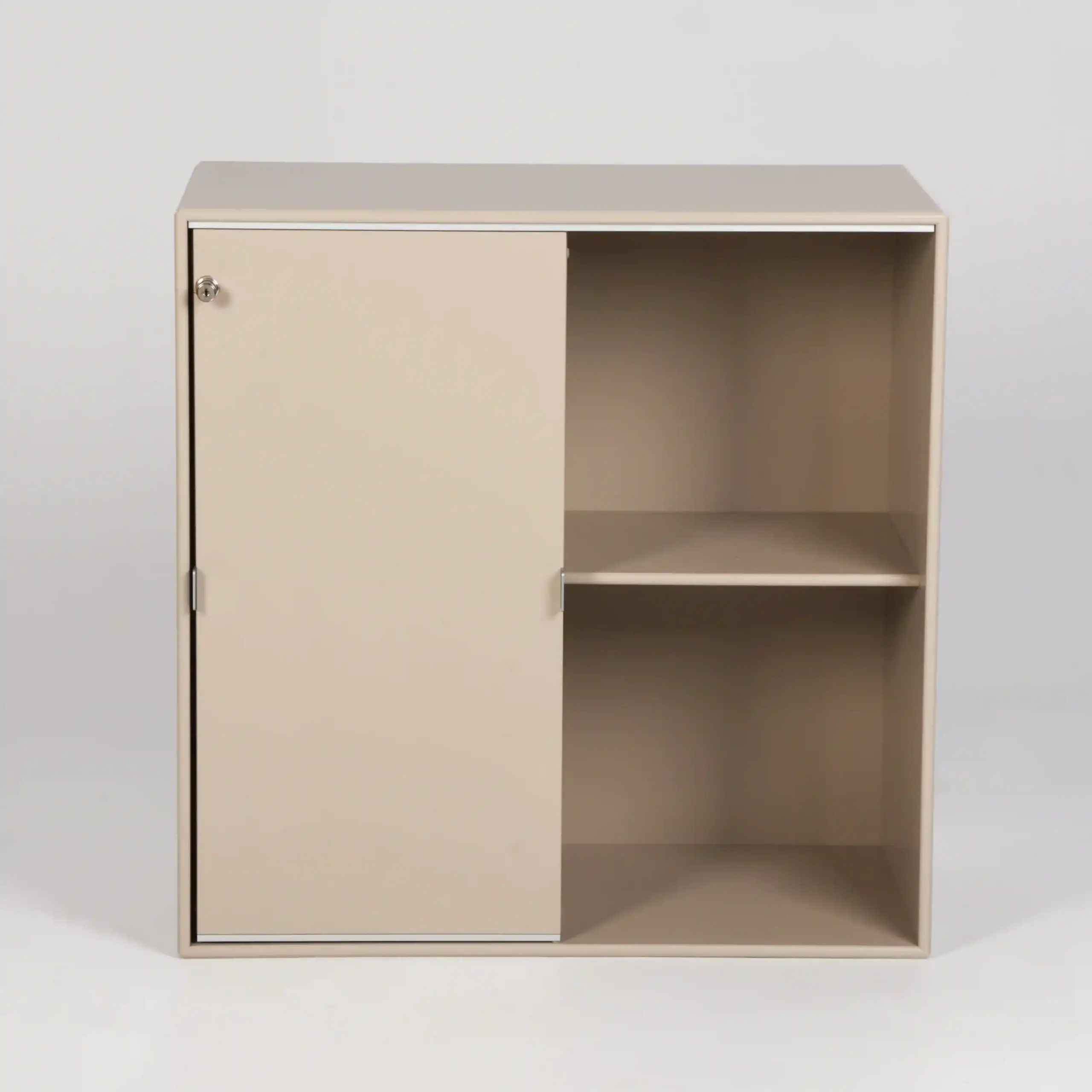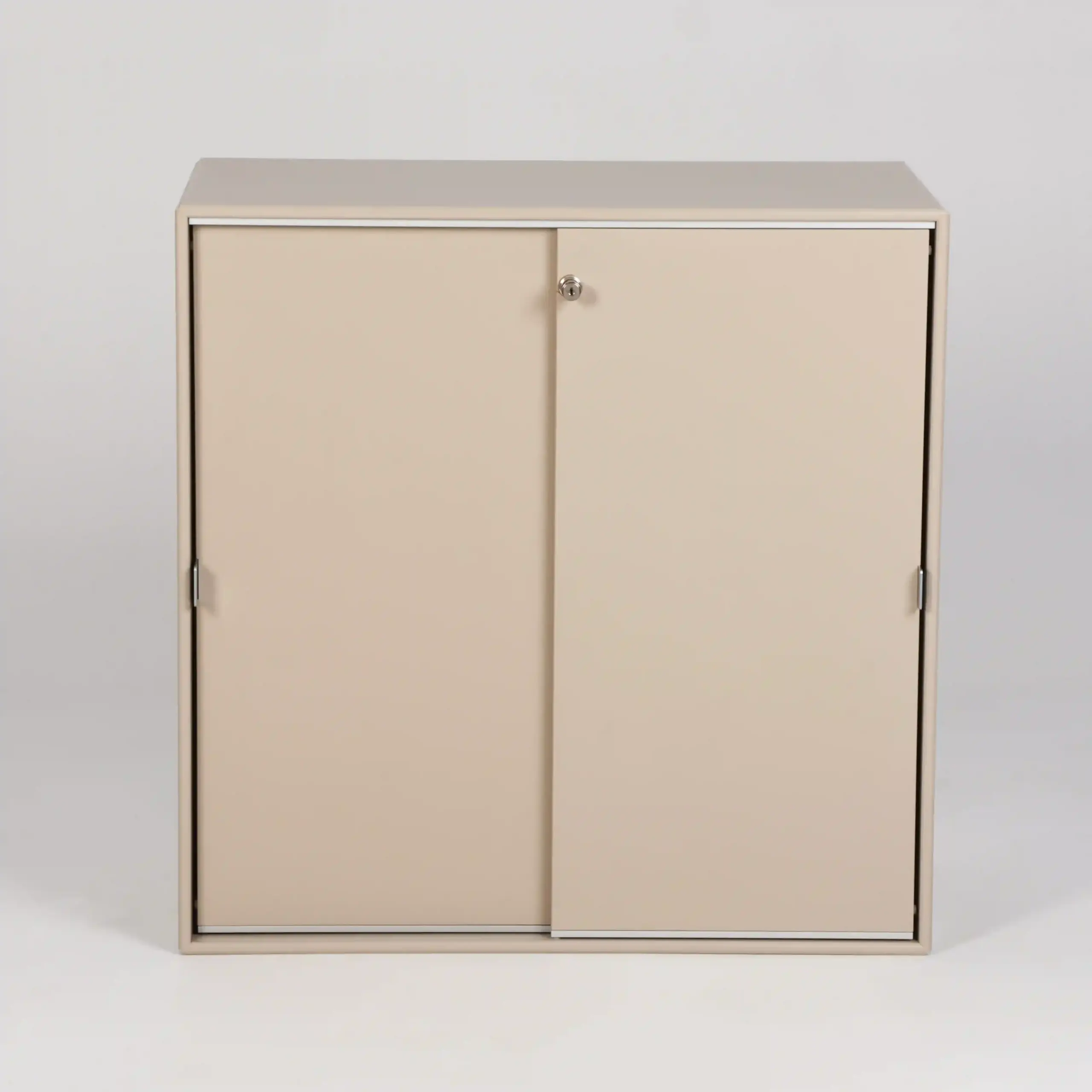 Flot væghængt skab fra Montana med to skydelåger i beige-lakeret MDF.