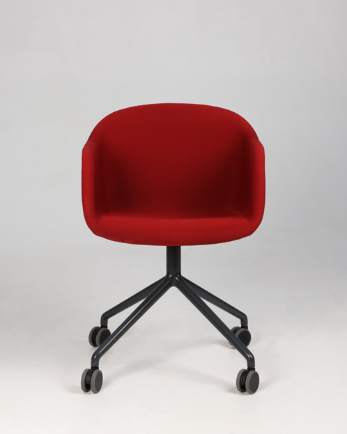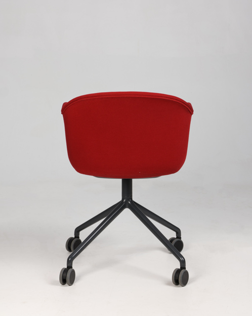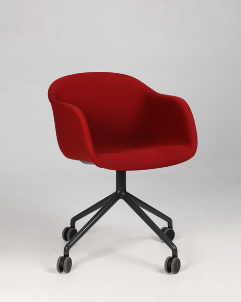 "Muuto Fiber konferencestol i rød steelcut med sort aluminumsstel og hjul.
