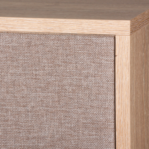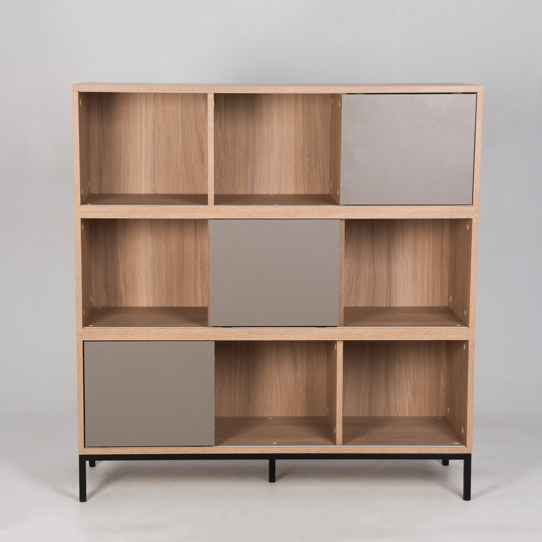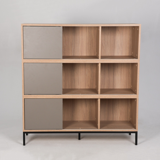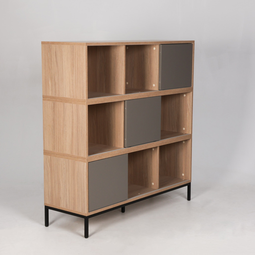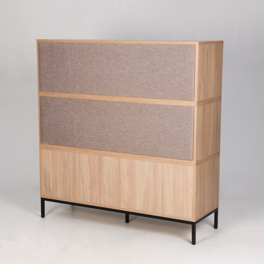 "Narbutas reol i egefinér med tre skydelåger i gråbeige laminat og stel i sort pulverlakeret stål. Polstret bagbeklædning til brug som både opslagstavle og som en forbedring af akustikken.