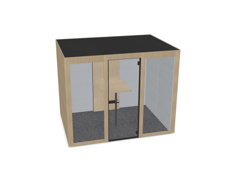 Denne mødeboks har flere forskellige lysindstillinger, ventilationsanlæg, højbord, medievæg og en dør i tempereret glas. Mødeboksen kan også fås med sofaer og bord (72 cm).