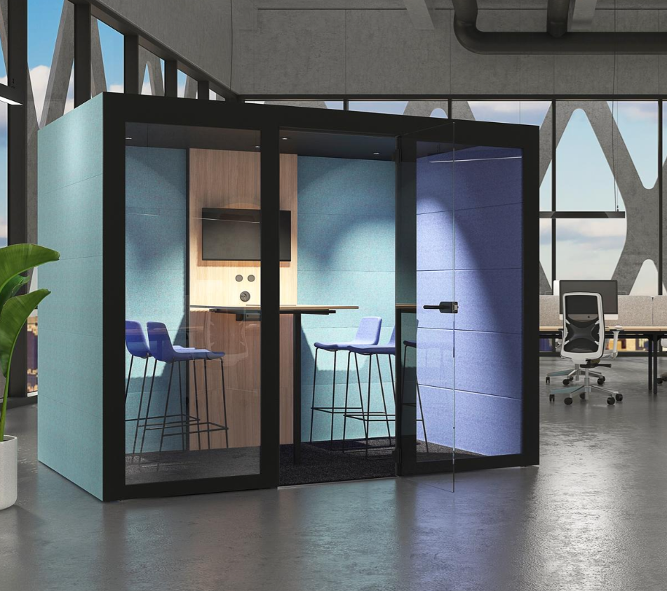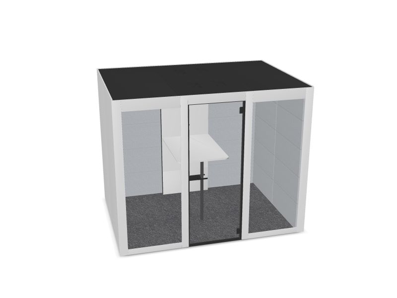 Denne mødeboks har flere forskellige lysindstillinger, ventilationsanlæg, højbord, medievæg og en dør i tempereret glas. Mødeboksen kan også fås med sofaer og bord (72 cm).