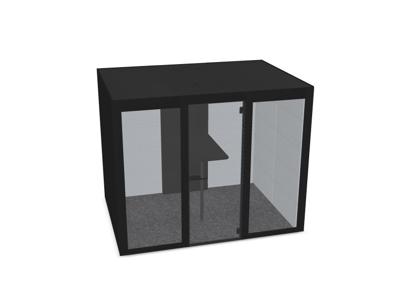 Denne mødeboks har flere forskellige lysindstillinger, ventilationsanlæg, højbord, medievæg og en dør i tempereret glas. Mødeboksen kan også fås med sofaer og bord (72 cm).