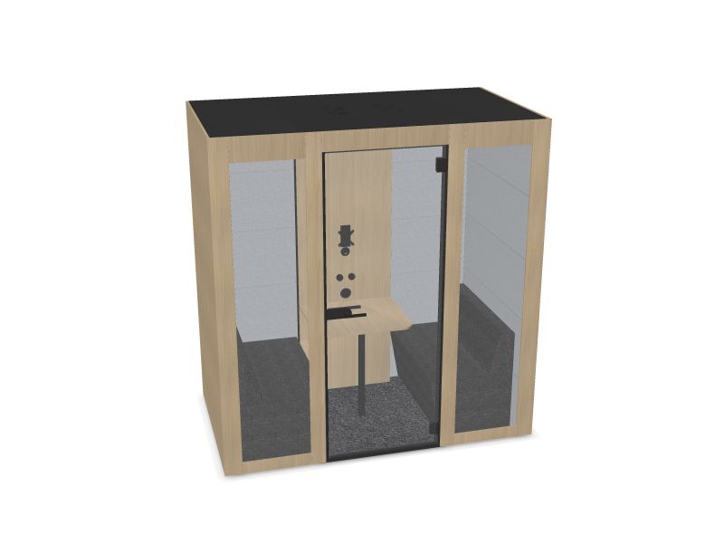 Denne variant er med en flot decor laminat i eg på ydersiden, og inderside i lysegråt Berta polstring. Denne mødeboks har flere forskellige lysindstillinger, ventilationsanlæg, bord, sofaer, medievæg og en dør i tempereret glas. Mødeboksen kan også fås med højbord i stedet.