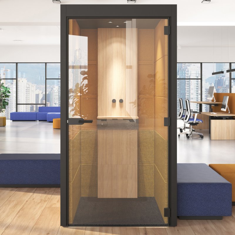 "Narbutas Silent Room er et lydabsorberende og eksklusivt møderum, ideelt til åbne kontormiljøer, hvor der ikke er mulighed for at trække sig tilbage og holde møder. Det kompakte Silent Room er perfekt til korte onlinemøder eller telefonsamtaler, uden at forstyrre kollegerne.