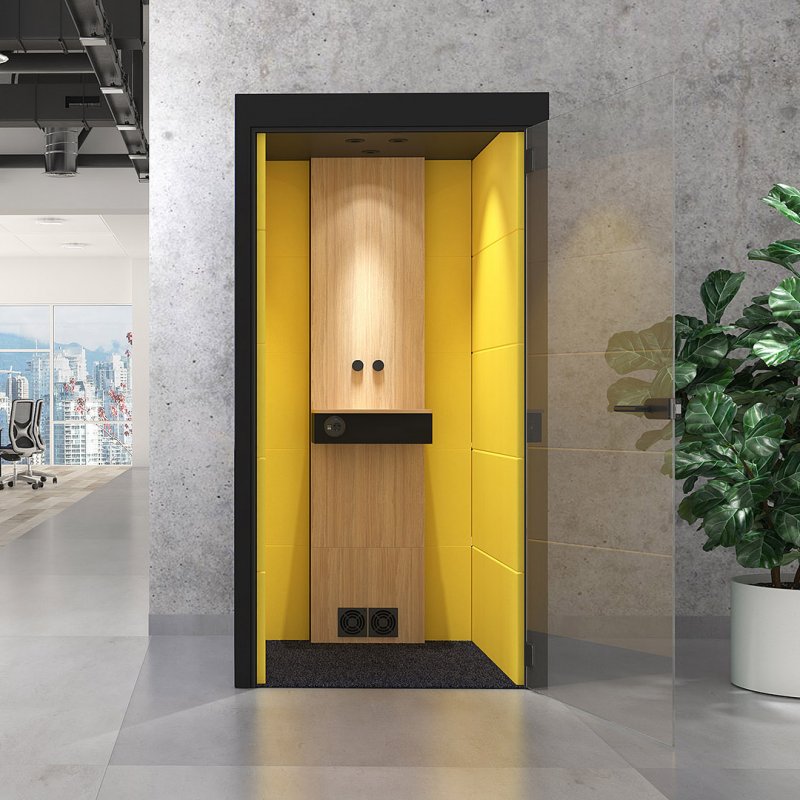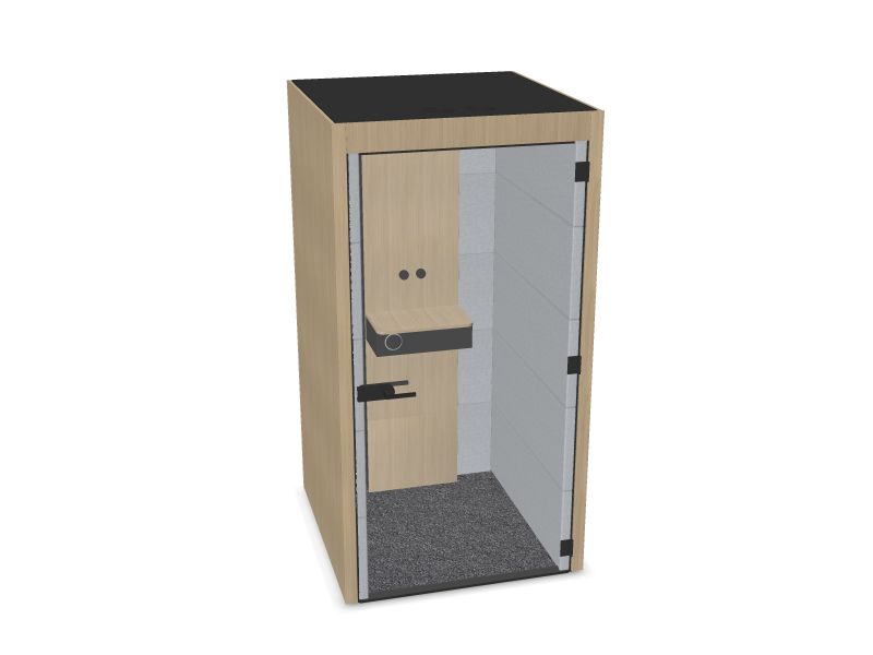 Mødeboksen tilbyder flere forskellige lysindstillinger, et ventilationssystem, højbord, strømforsyning og en dør i hærdet glas. Standardleveringen inkluderer en højrevendt dør, men den kan også fås venstrevendt. For øget sikkerhed kan en brandalarm tilkøbes.
