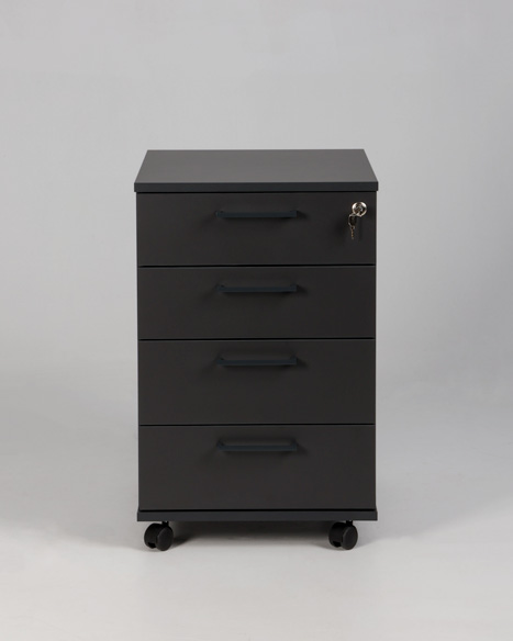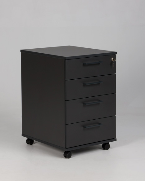 "Narbutas skuffekassette udført i sort decor laminat med låsbare hjul. Varianten har fire skuffer og er udstyret med centrallås.