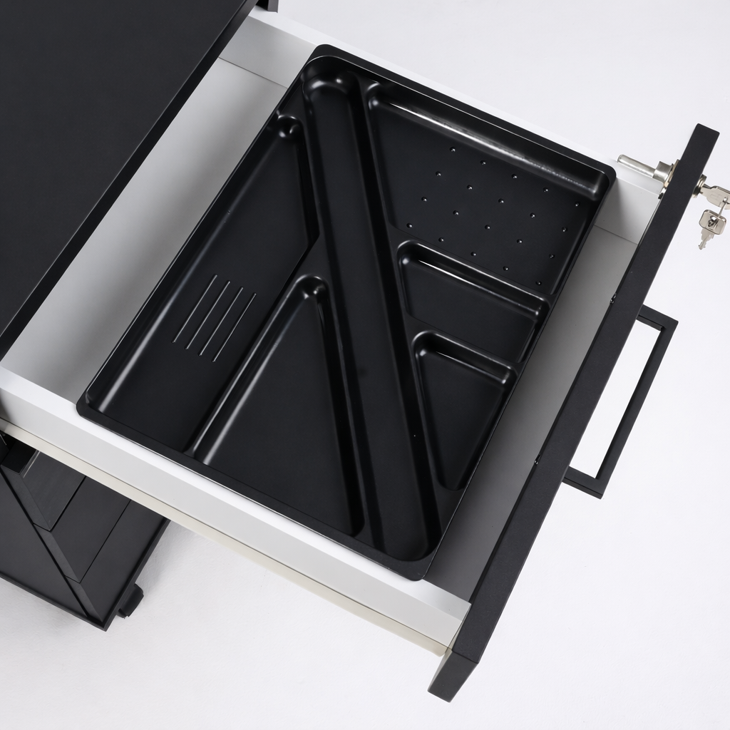 Der medfølger en udtagelig pennebakke, som giver mulighed for at skabe orden i kuglepenne og andre små kontorartikler.