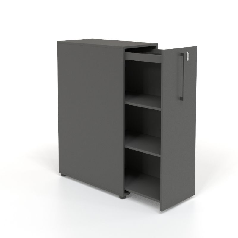 "Narbutas Tower højrevendt udtræksskab, udført i antracitgrå decor laminat. Skabet har faste hylder med god plads til bl.a. ringbind, brevbakker, andre kontorartikler samt private ejendele. Det smarte opbevaringsmøbel kan aflåses og desuden fungerer godt som en skillevæg, for opdeling af arbejdsstationer – eksempelvis i åbne kontorlandskaber.