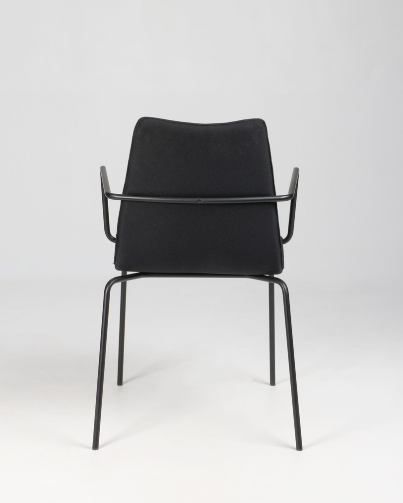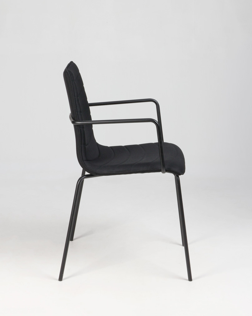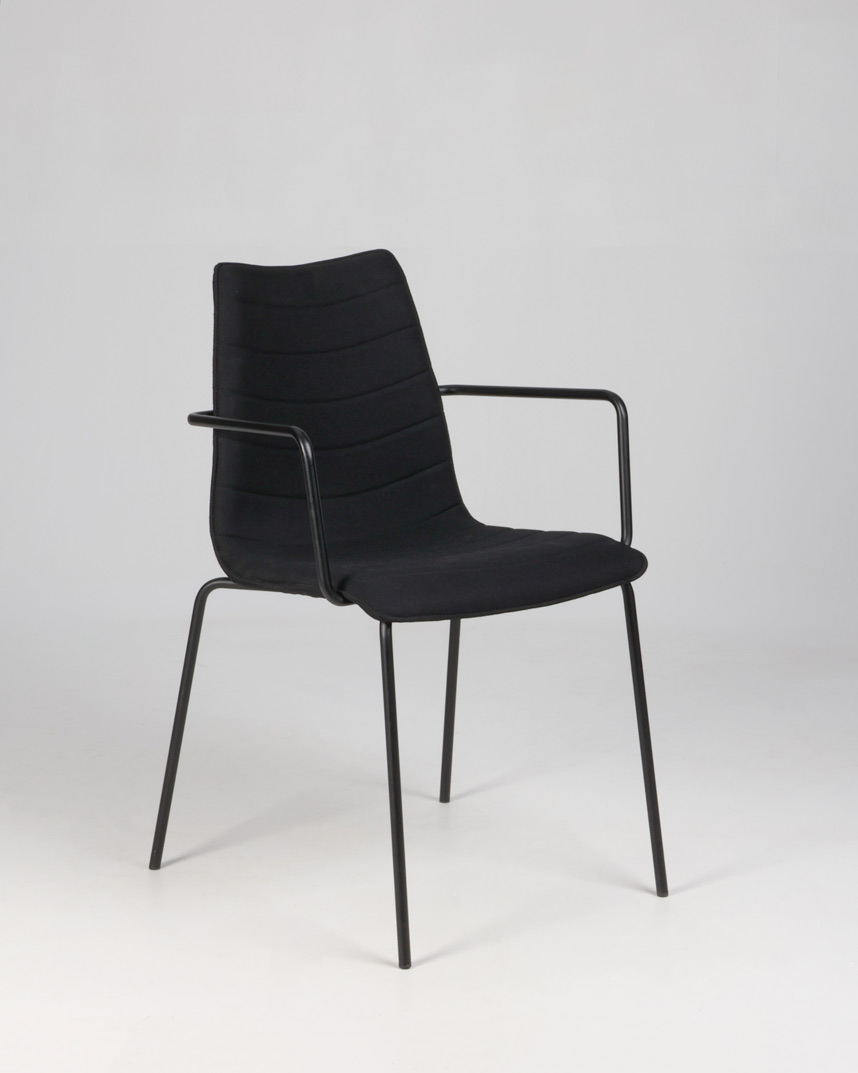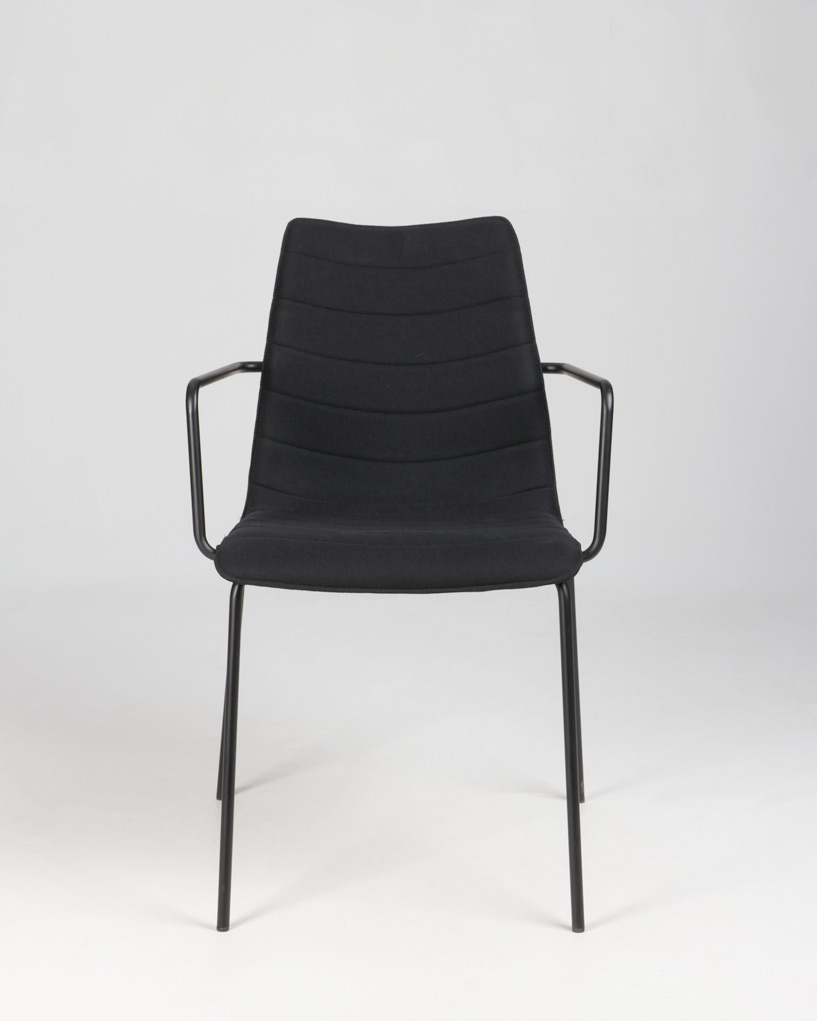 "Narbutas Twist&Sit konferencestol med armlæn, fuldpolstret og betrukket med slidstærkt betræk med kanalsyninger. Stolen er stabelbar med sort stel i pulverlakeret stål og passer med sit enkle og lette design, godt ind i de fleste mødelokaler.