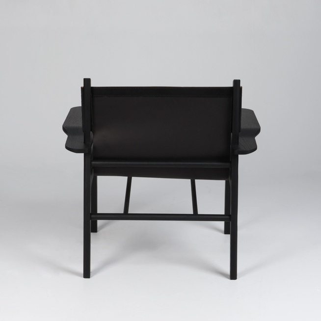 Flot loungestol i sortbejdset massiv egetræ med sæde og ryg i sort læder. NDG02 er designet af Jeppe Olesen i samarbejde med Nordic Design Garage. Stolen har flere fine håndværksmæssige detaljer samt messingbeslag ved læderet.
