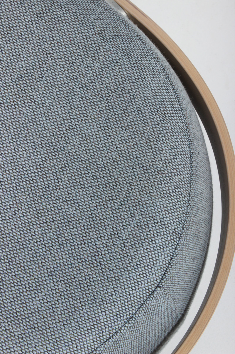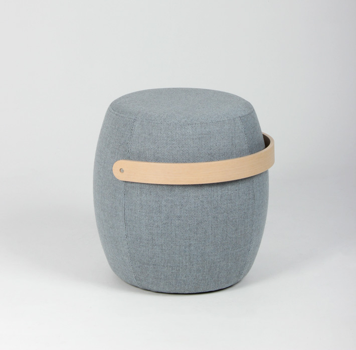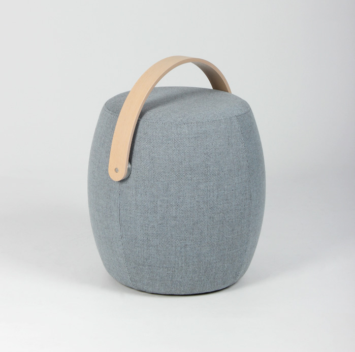 "OFFECCT Carry On puf betrukket med lys blå møbeltekstil og greb i lakeret ask.