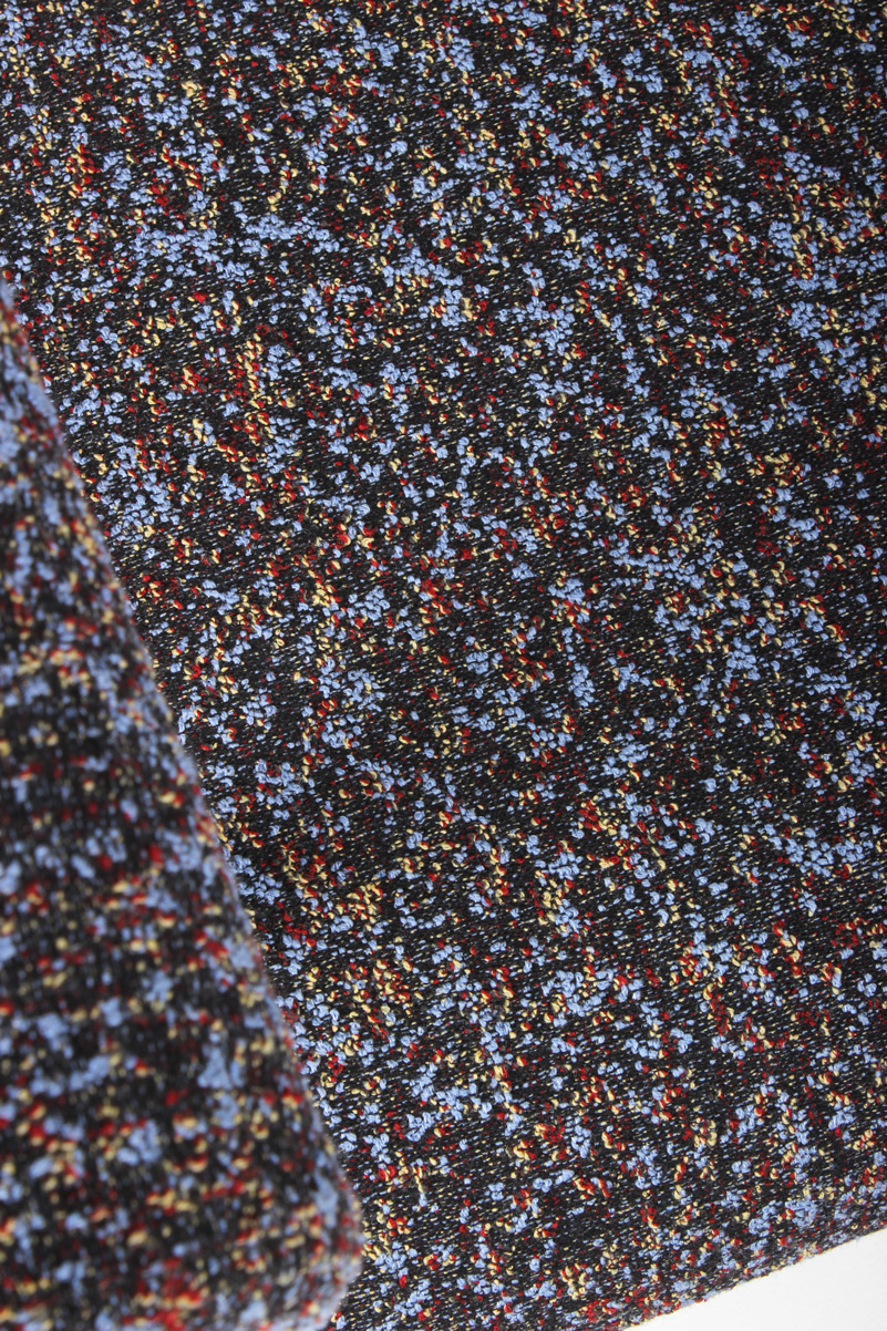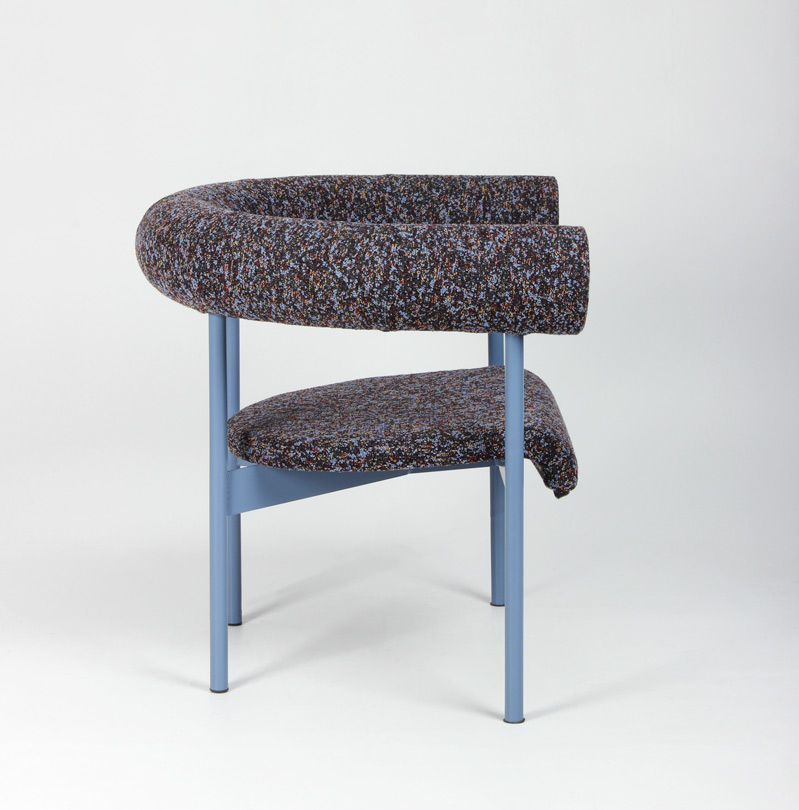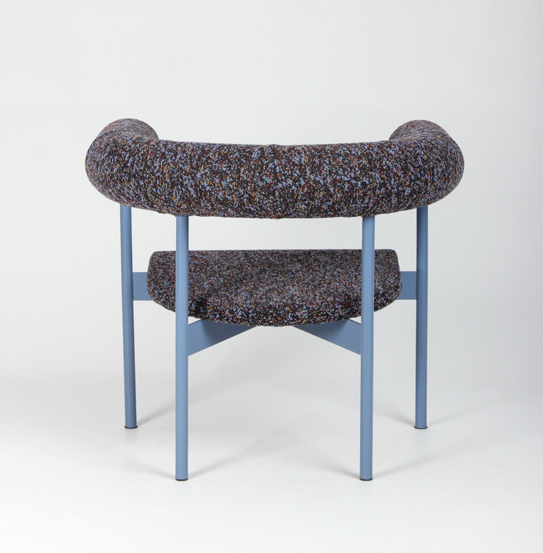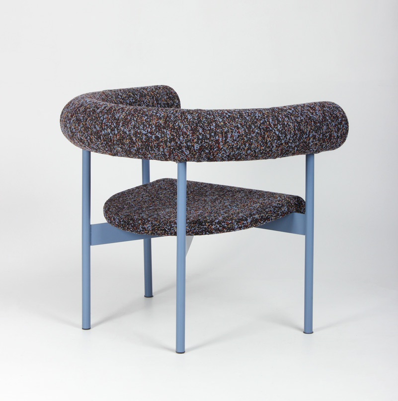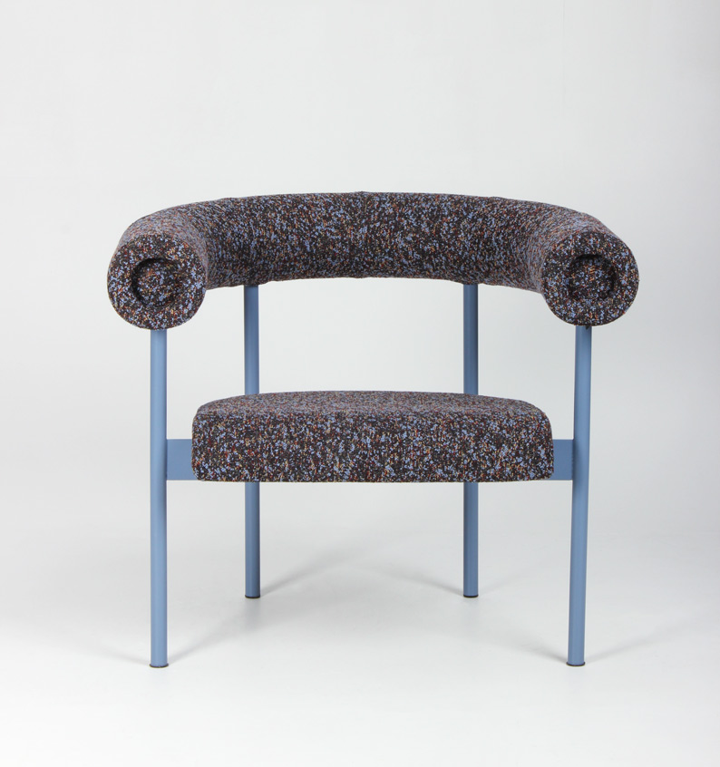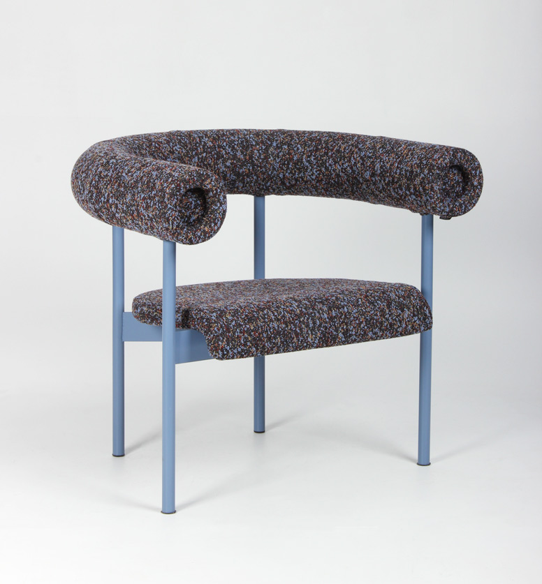 "OFFECCT Font Easy loungestol, polstret i rygstykke og sæde, og betrukket med farverigt, mønstret tekstil. Den unikke og komfortable loungestol er designet af Matti Klenell.