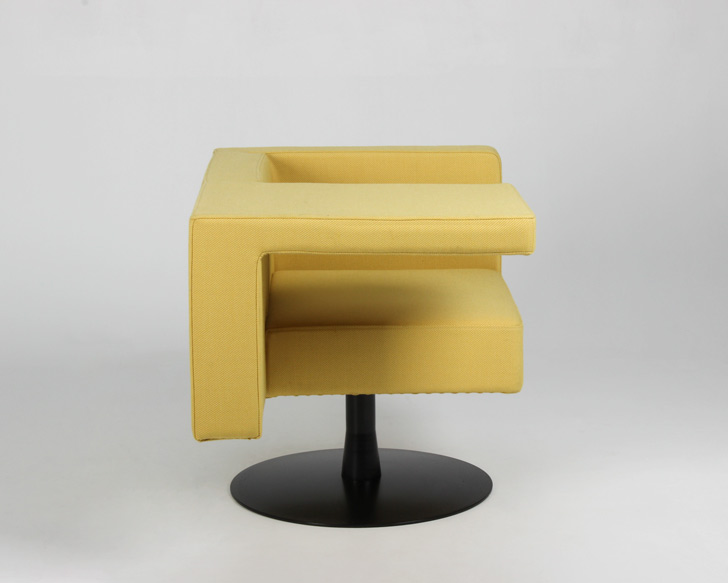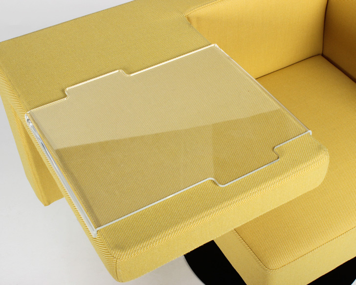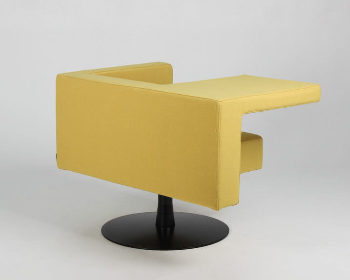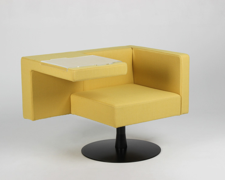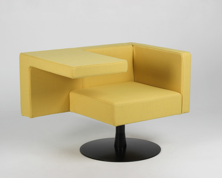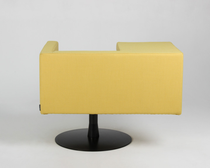 "OFFECCT Solitaire loungestol i gul fame med drejesokkel i mat sort stål. Stolen har kombineret armlæn og bordplade og er perfekt til uformelle møder i loungeområdet, eller eksempelvis i terapilokalet med lange samtaler og klienthåndtering, hvor den praktiske bordplade kan være en god støtte ved notatskrivning.