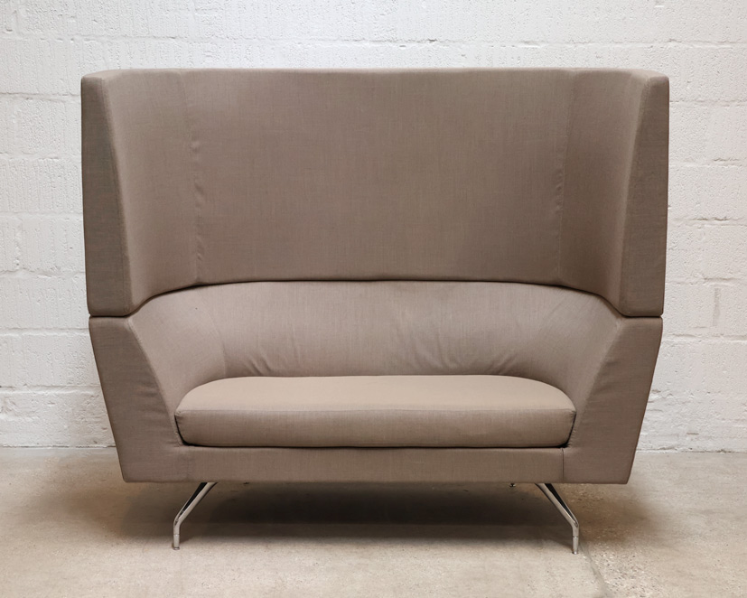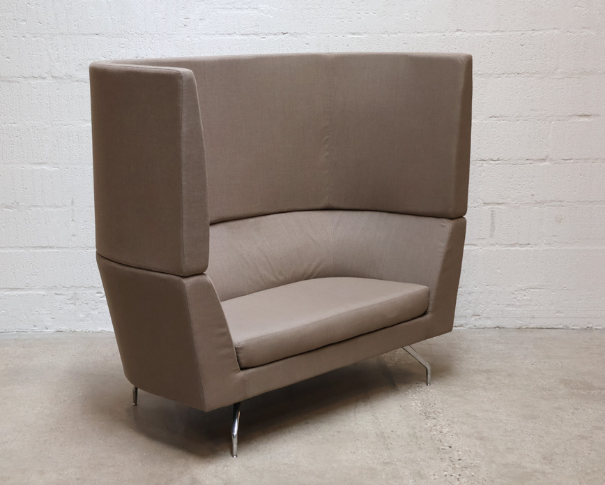 "Orangebox Cwtch akustik sofa i gråbeige med vægge – for et effektivt lyd- og støjreducerende miljø. Sofaen er perfekt eksempelvis til loungeområdet, receptionen eller det åbne kontormiljø, hvor der er behov for diskrete samtaler eller telefonopkald uden omgivelserne forstyrres.