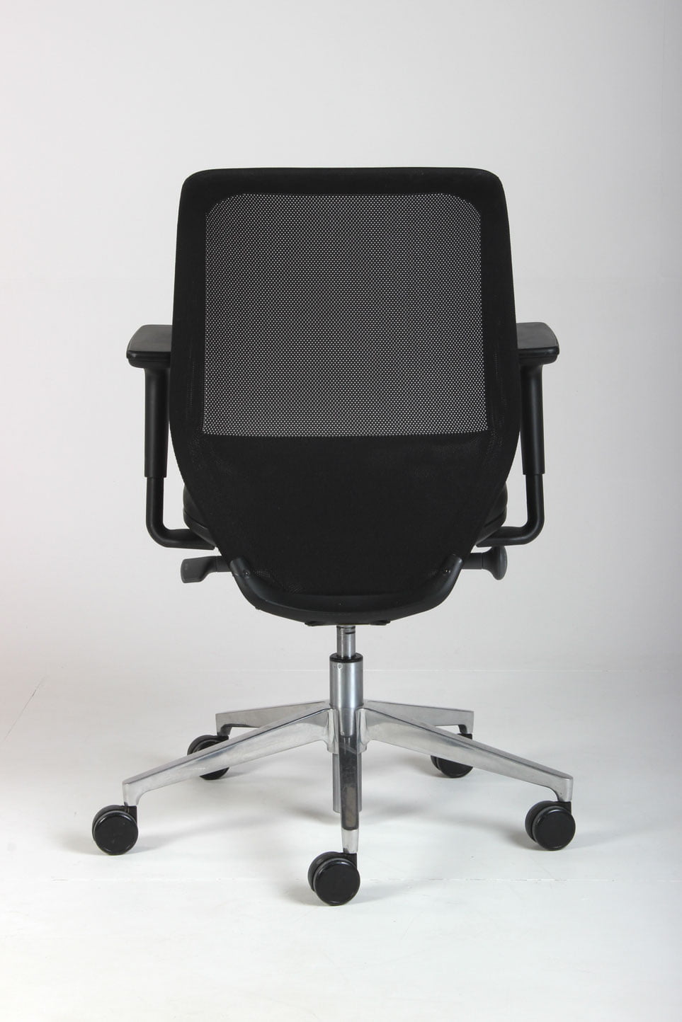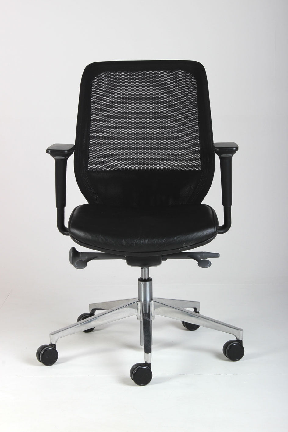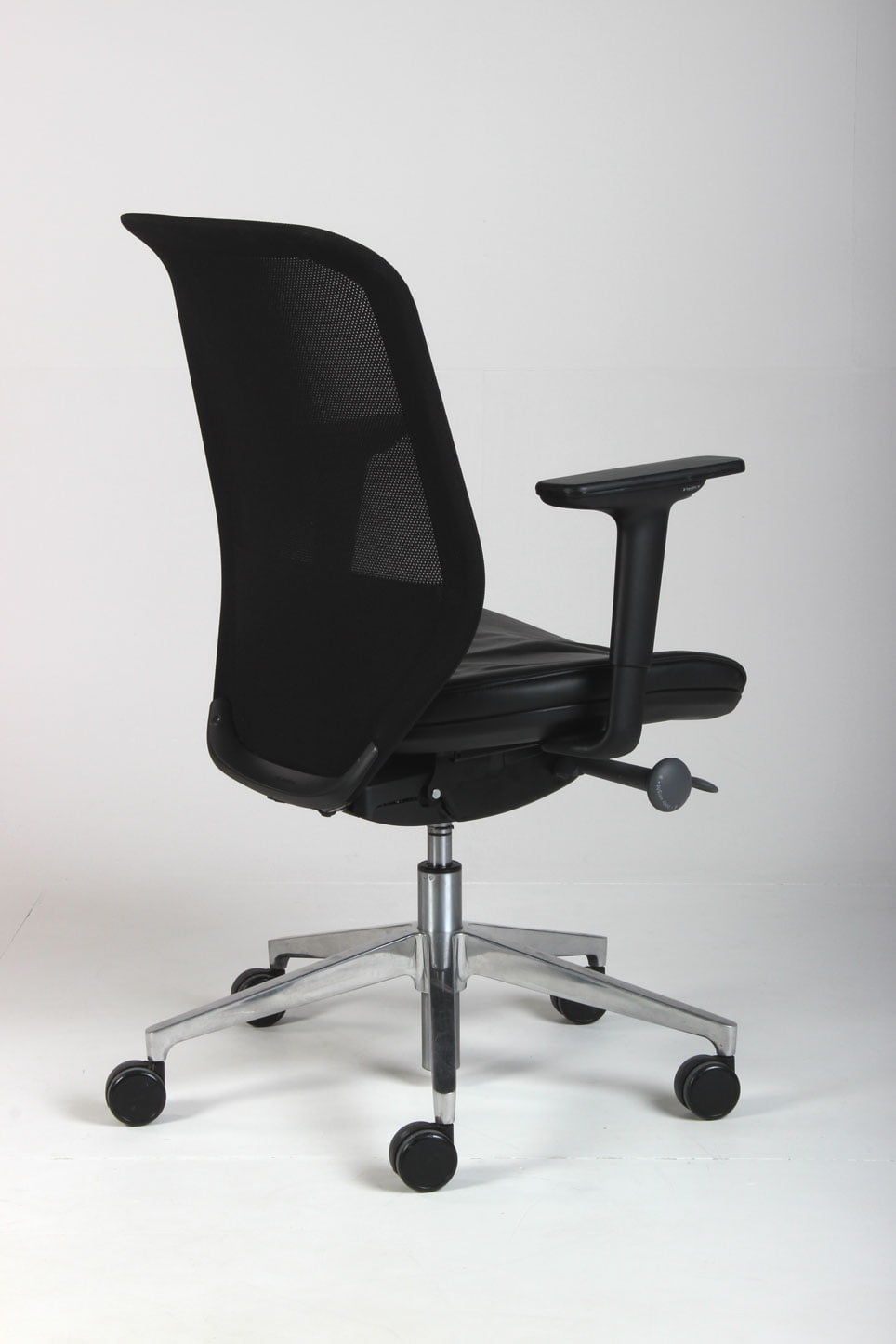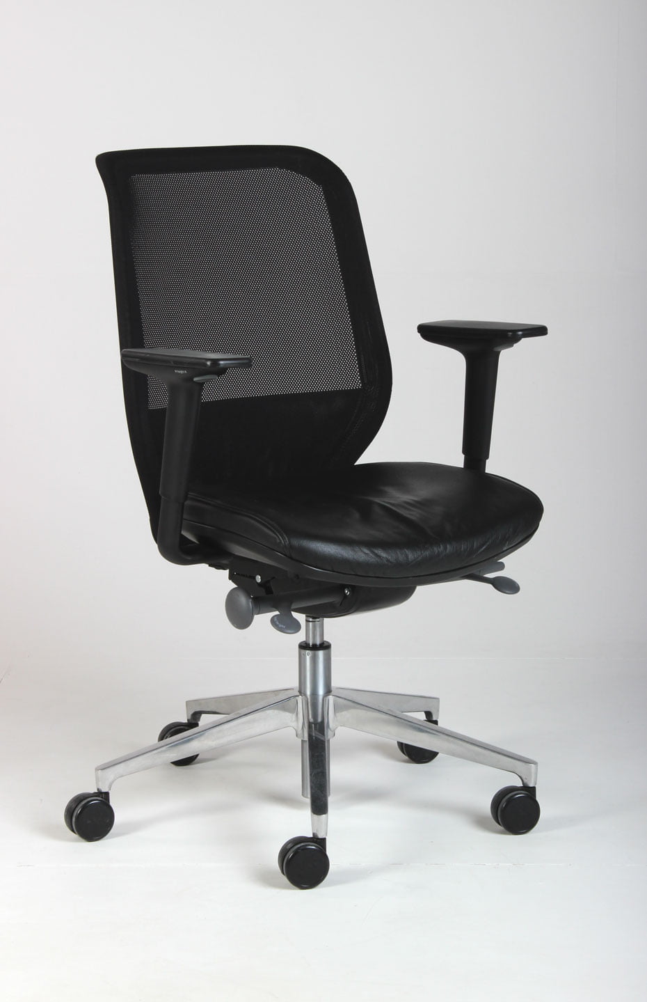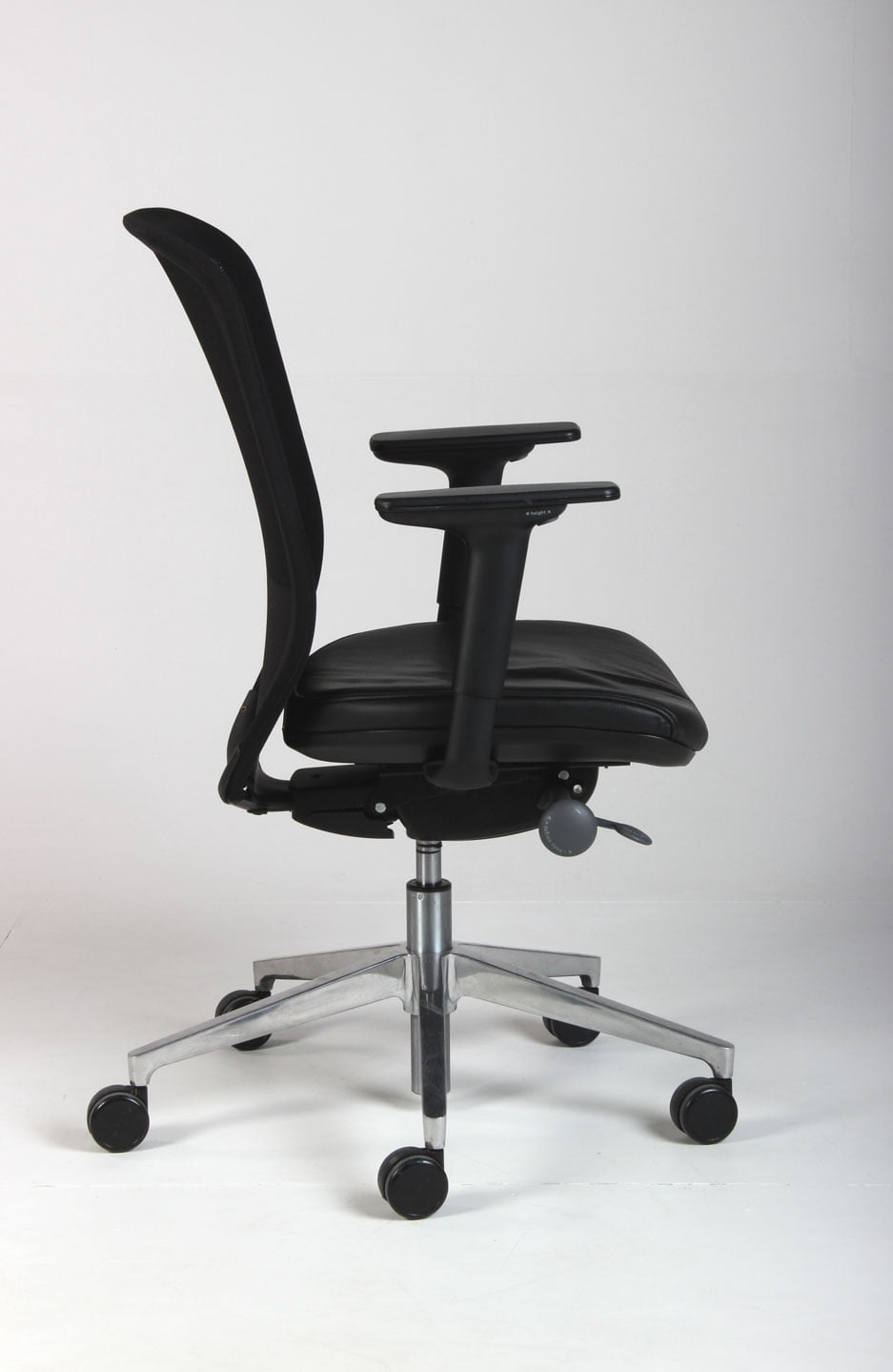 "Orangebox Joy12 kontorstol med sort læderbetrukket sæde og rygstykke i mesh og poleret aluminiumsfodkryds.