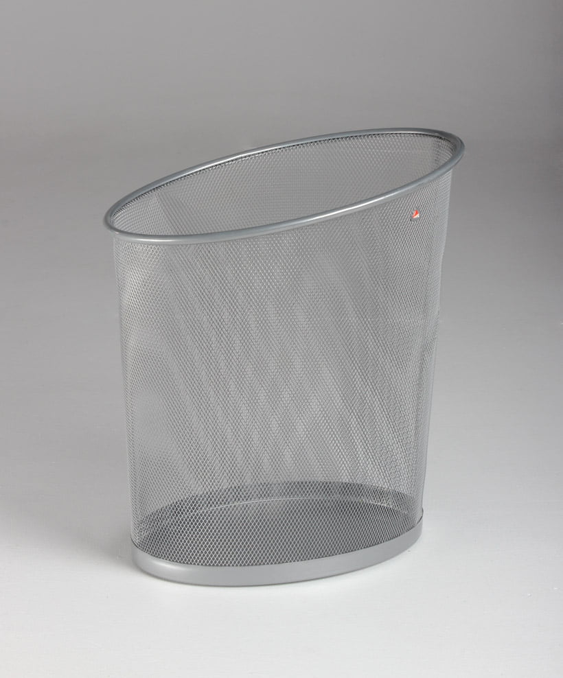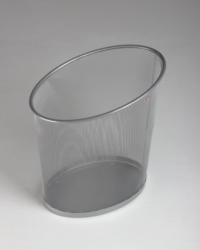 "Oval og asymmetrisk papirkurv i grå trådmetal.