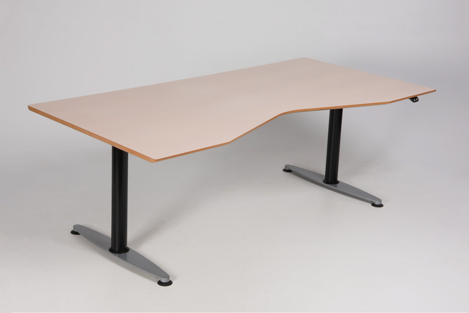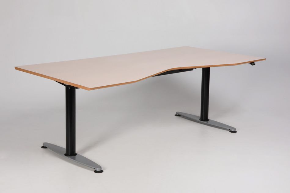 "Paustian hæve-sænkebord med bordplade i hvidpigmenteret ahorn med spids mavebue, lige kanter på de korte sider, samt affasede på brede sider. Det sorte stel med grå fødder har tre led og to motorer der kan justere højden fra 64-127 cm, så det nemt tilpasses både stående og siddende kontorarbejde. I stellet er integreret en praktisk kabelbakke, der samler og holder orden på kabler fra PC og øvrigt elektronisk udstyr.